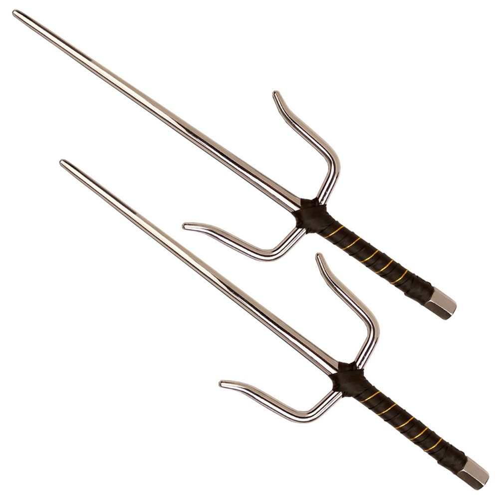 The Sai is a traditional Japanese weapon that is comprised of a long pointed baton with two smaller prongs sticking out of each side. These non-lethal weapons have non-sharpened and blunt edges. Sais are usually used together in a pair, wielding one in each hand.