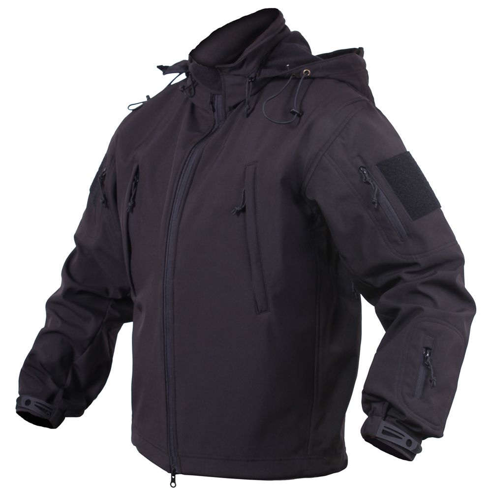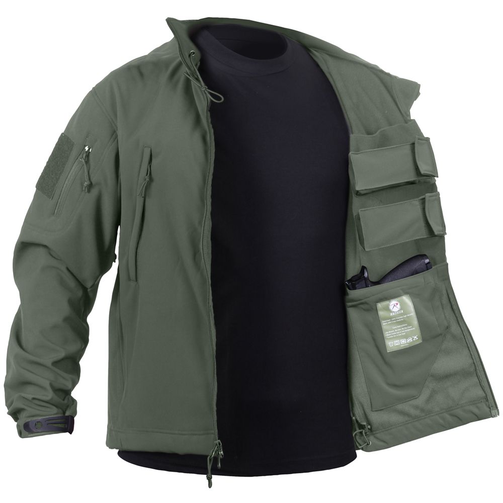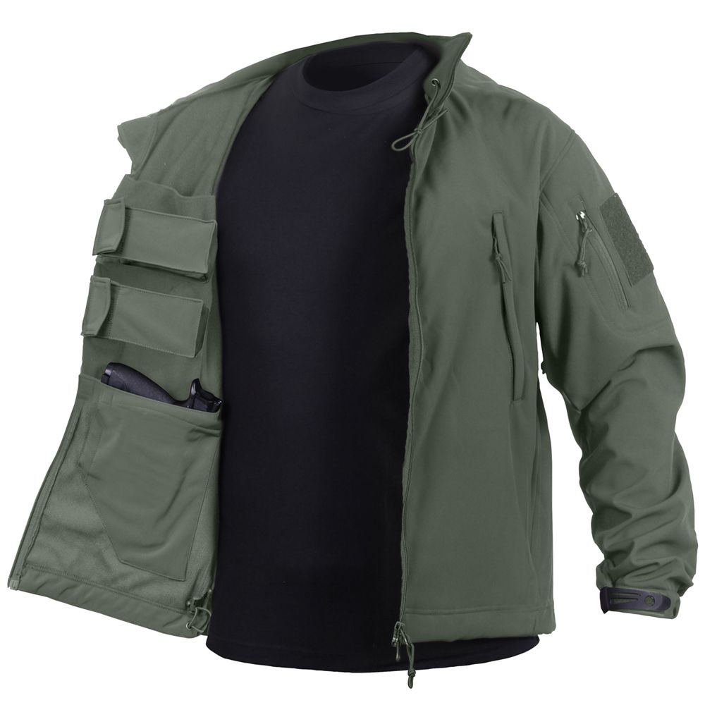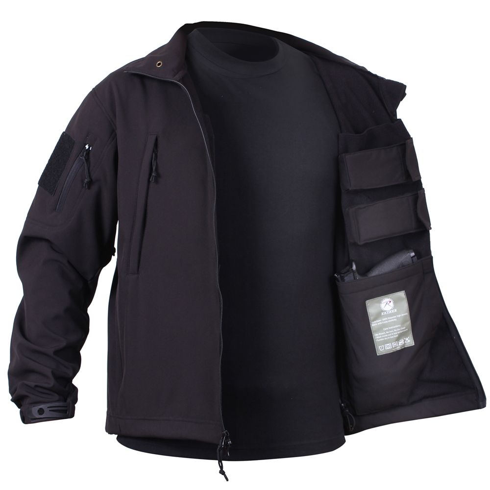 Concealed Carry Soft Shell Jacket is the ultimate tactical jacket equipped with a concealed carry pocket with hook & loop closure on each interior side of the jacket (the jacket will work for both left and right-handed draw) and 2 hook and loop closure mag pouches on each interior side to give optimal storage for firearms and firearm accessories. This tactical jacket features a polyester waterproof outer shell and inner lightweight and breathable fleece-lining ideal for extreme temperatures. In addition, the soft shell jacket features zippered pockets on each shoulder with a square loop field for patches, a forearm pocket on the left sleeve, two front slash pockets, and two back pockets. Elastic, hook and loop adjustable wrist cuffs allow for a perfect, comfortable fit. The drawstring concealed hood is detachable.