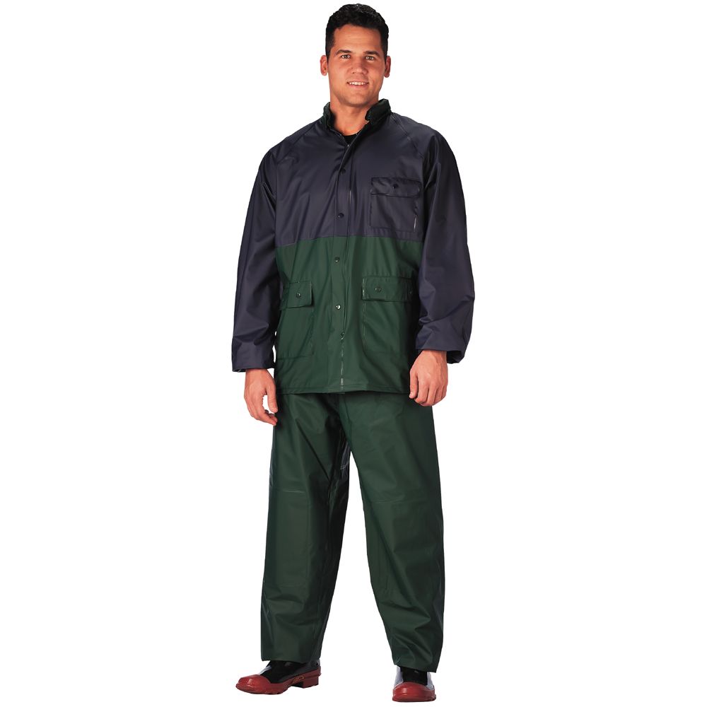 Mens 2 Piece Navy & Green Pvc Rainsuit features .20mm PVC , Nylon zipper w/storm flap , Concealed hood , Elastic wrists , Ventilated underarms , 3 cargo pockets , elastic waist pants w/snapped cuffs