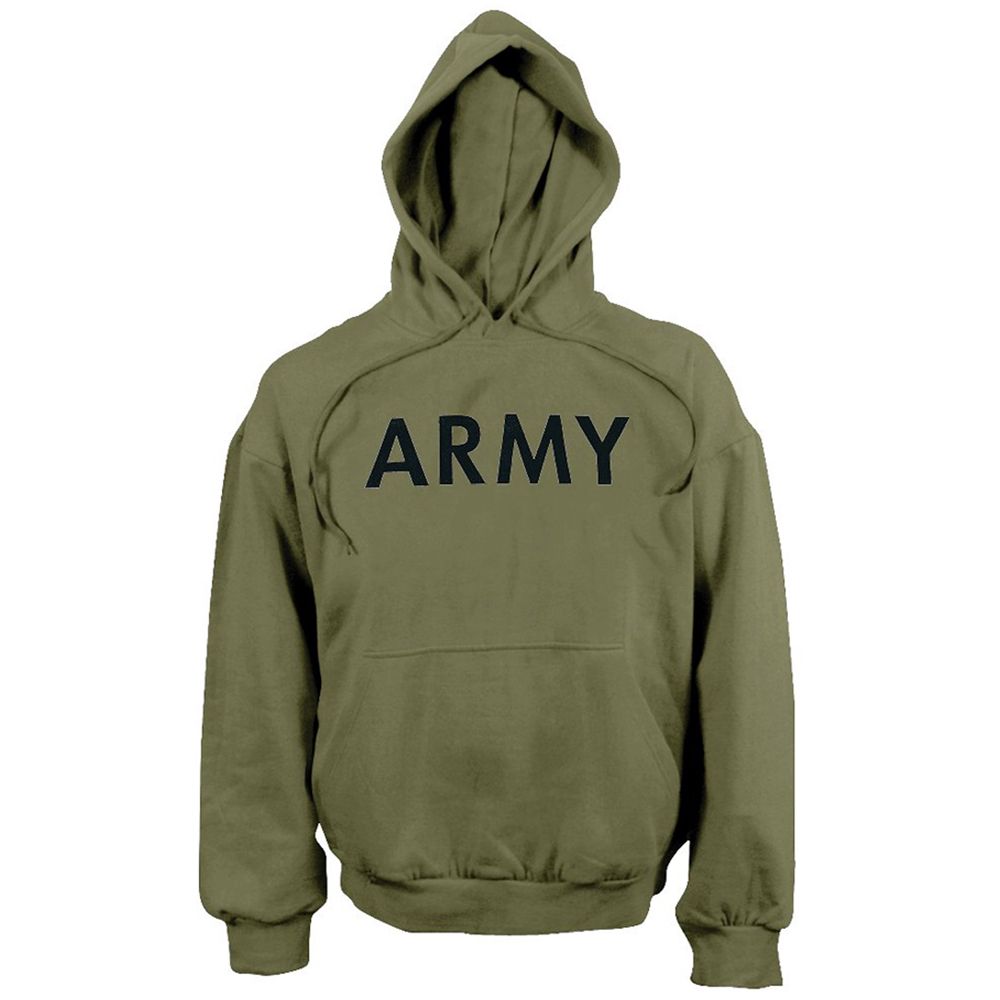 Physical Training Army Pullover Hooded Sweatshirt features poly/cotton blend that are fleeced lined with a drawstring hood and front pouch pocket.