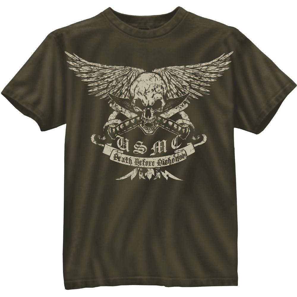 This is a comfort fitting T-shirt in olive drab. The material used is 100% cotton (ring spun), which means it can ‘breathe’ well, thus providing the best comfort. The design is great too. There is a skull with large wings and two knives across its mouth. The slogan says ‘USMC Death before dishonor’. The print is in white, which makes it stand out against the olive drab background. As one would expect, this heavy duty T-shirt is easy to maintain. Since it goes well with most of the leg wears among men and women, it’s a great wear to have