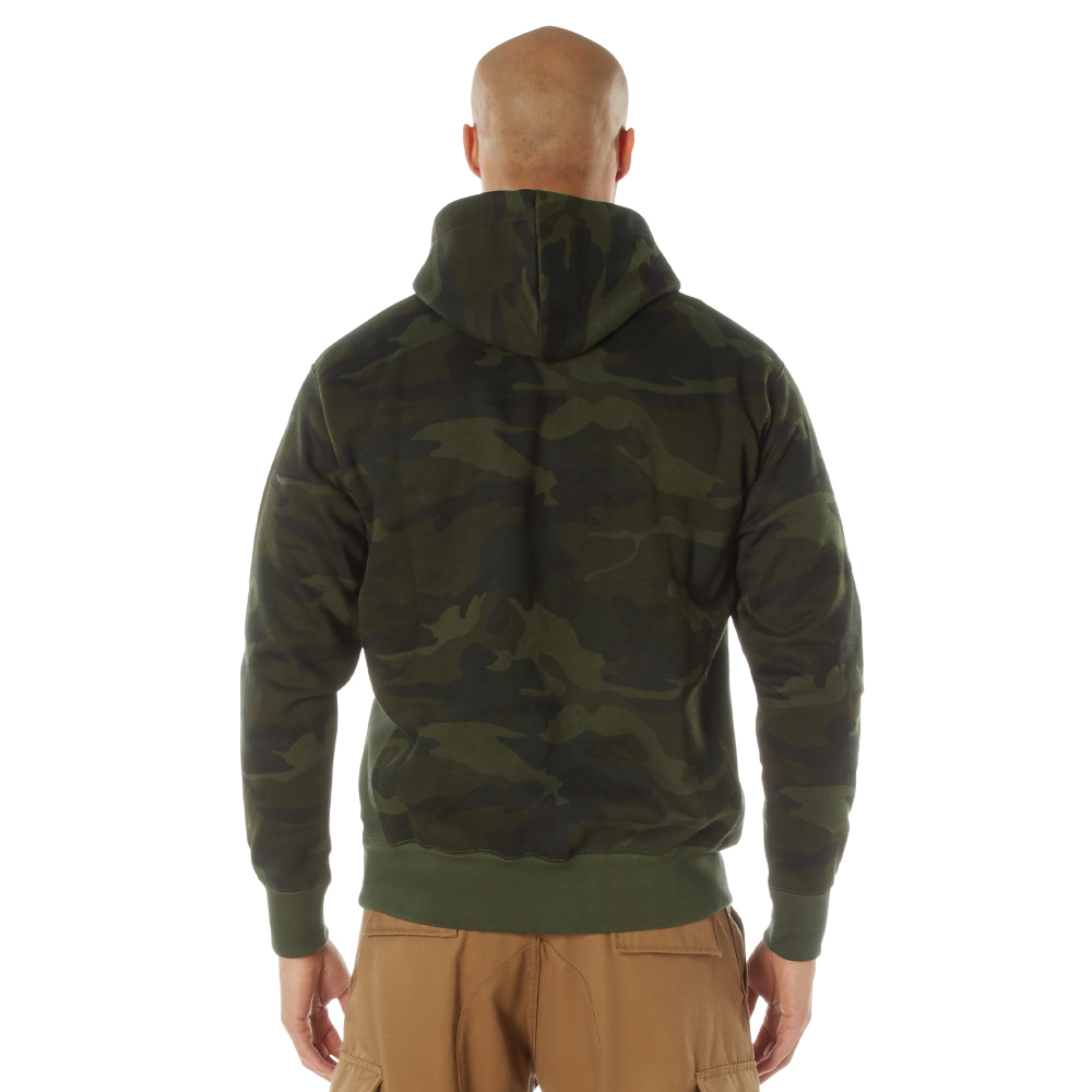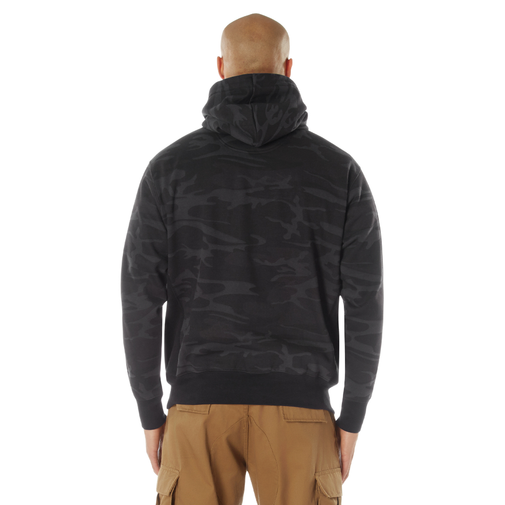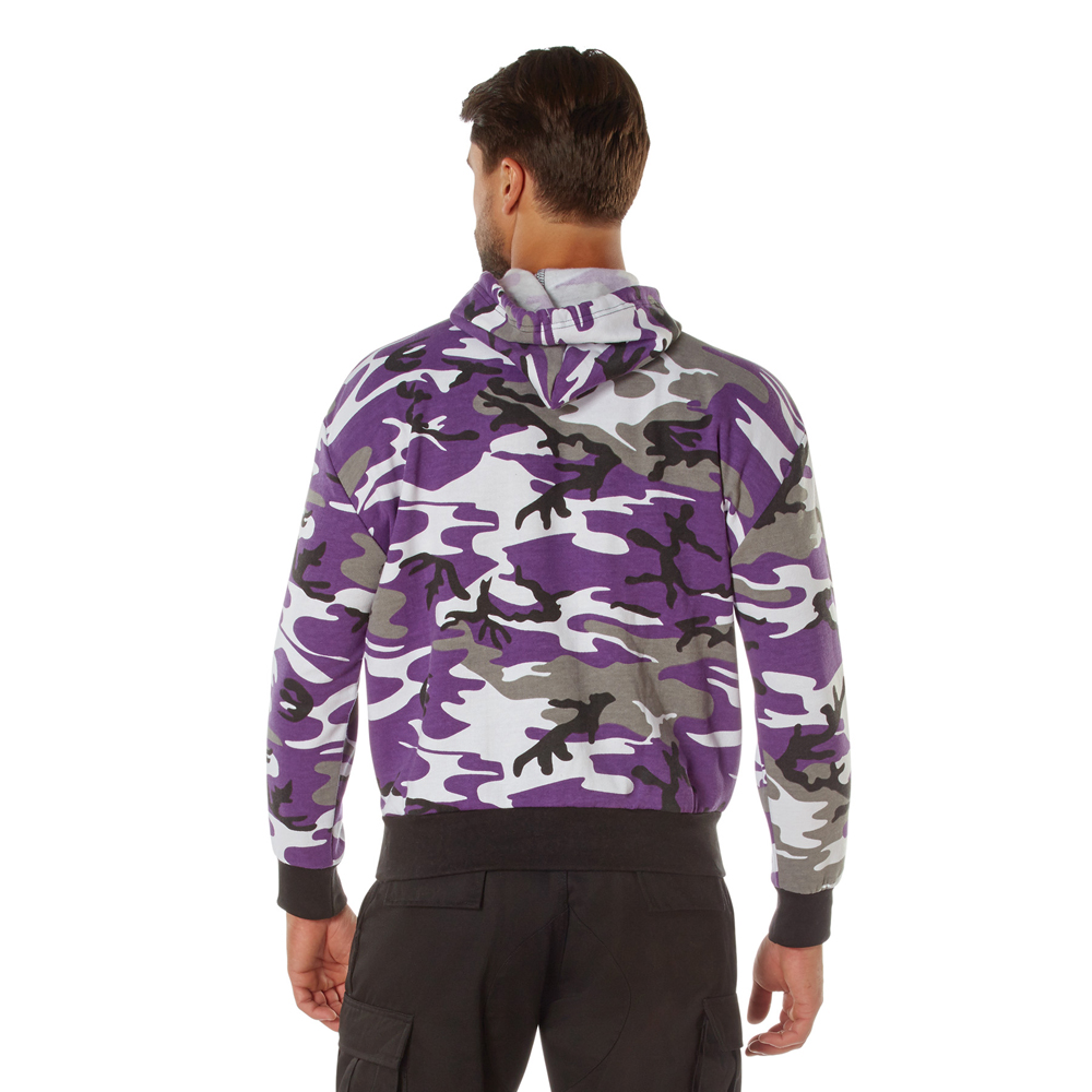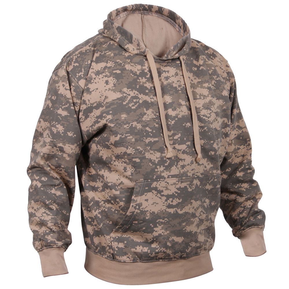Camo Pullover Hooded Sweatshirt is made of durable 60% cotton and 40% polyester material and a comfortable fleece interior lining for warmth. Elastic knit wrist cuffs and waistband allow this hooded camo sweatshirt to have the perfect fit. The camo hoodie features a drawstring hood, a large front slash kangaroo style double pocket, and is available in several military-style camouflage patterns.