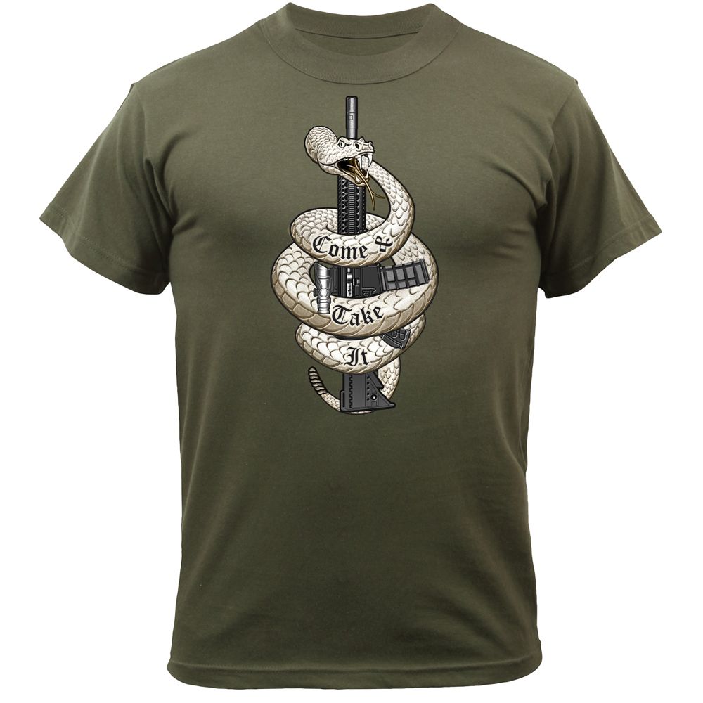 "Come & Take It" printed graphic t-shirt is 60% cotton/ 40% polyester material. The front graphic features the iconic expression of defiance "Come and Take It" with a detailed image of a rifle and snake.