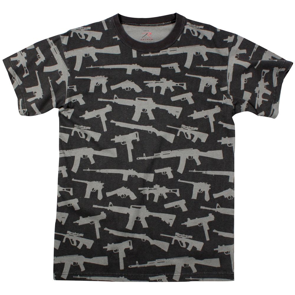 Dress up yourself like a true militant man with these Multi Print Guns T-shirts. The entire T-shirt comes with mini guns printed all over it on olive drab and black background, a color that speaks of GI style. The gun print includes various types of rifle motifs. This short sleeved olive T-shirt is made from best grade cotton and polyester mix material that gives you comfort and feels soft against your skin. The neck label comes in black and red and has no tags, which adds to the comfort. This T-shirt offers a vintage look to suit the style of any robust man