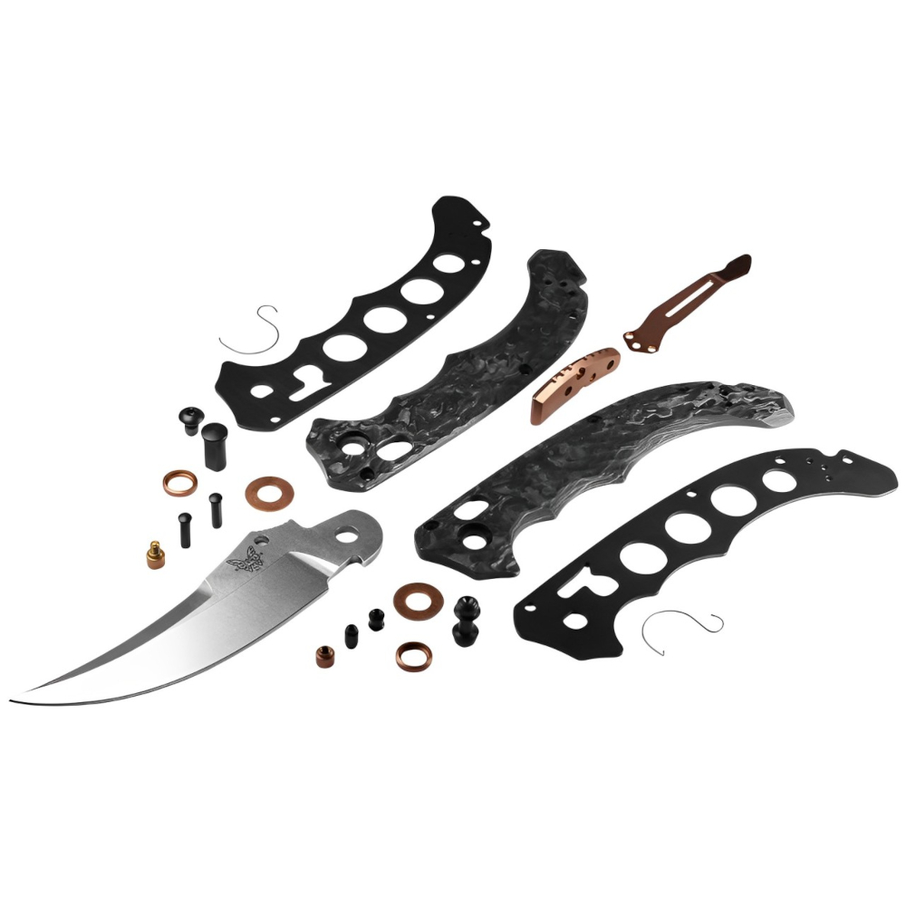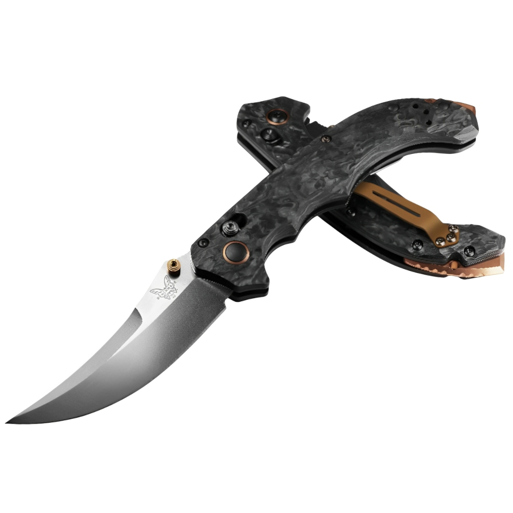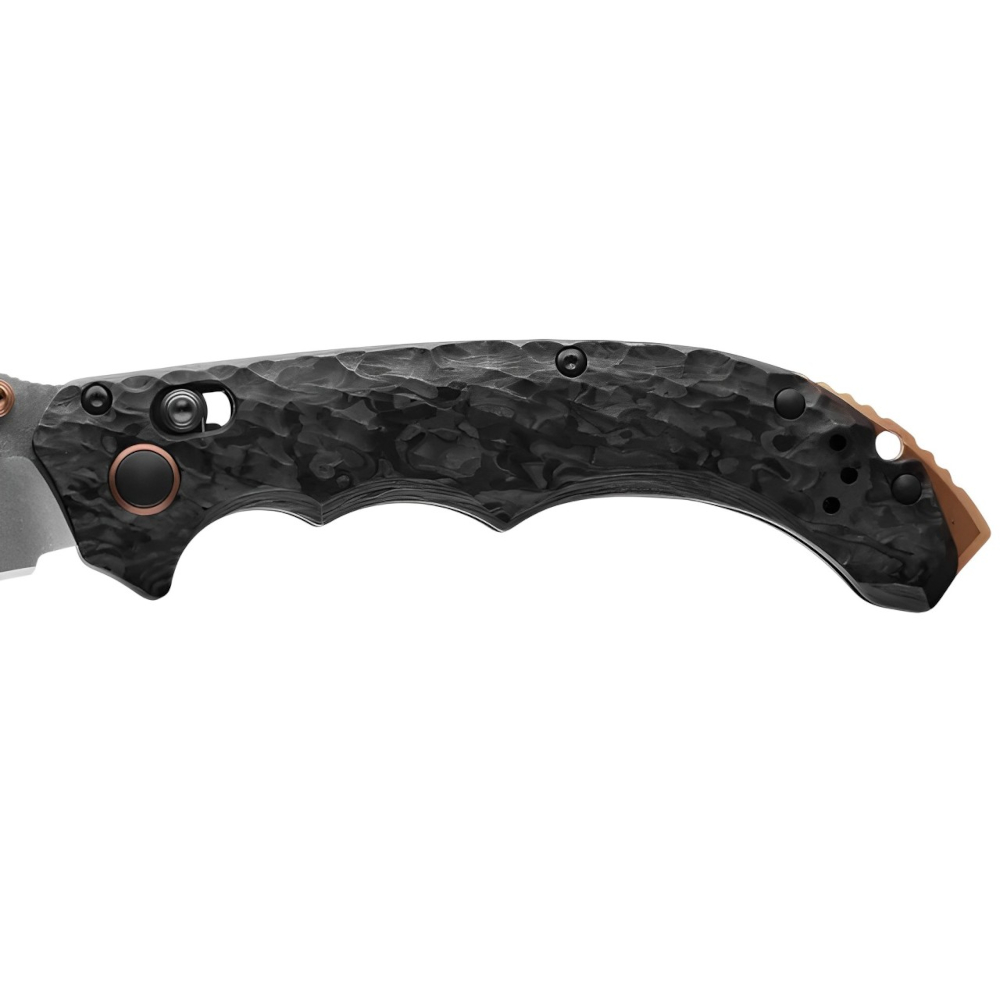 The Mini Bedlam Tactical Knife - Black Edition merges tactical performance with sleek design in a compact, everyday carry size. Featuring a premium CPM-S90V stainless steel blade with a satin finish, its upswept scimitar shape is perfect for precise hooking and slicing. The marbled carbon fiber handle is engineered for superior grip, with aggressive textures flowing along its curvature, ensuring stability during demanding tasks. Completed with black oxide and dark copper PVD hardware, this knife is a versatile tool with a bold aesthetic.