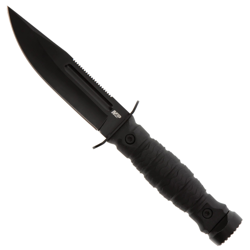 Constructed of 8Cr13MoV stainless steel with a rubberized polymer handle, this survival knife boasts impressive ergonomics and cutting strength. The blade features a plain edge with a sawtooth spine for cutting through tough surfaces. A polymer tactical sheath readily secures to MOLLE systems or belts up to 1.25" wide for a versatile carry.