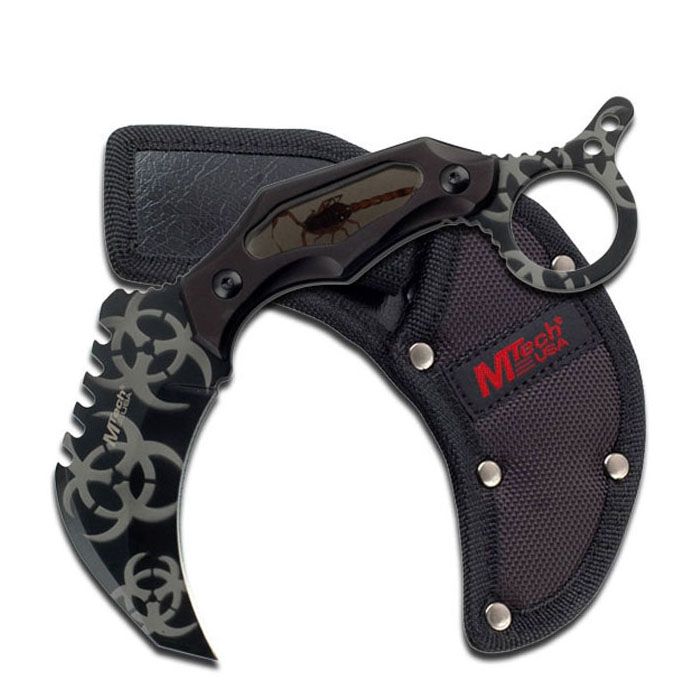 Introducing a compact and striking 7.5-inch knife with a unique touch. The 2.75-inch blade features an eye-catching biohazard pattern and a robust 3.5mm thickness. Its black handle with scorpion poly fitting not only offers a secure grip but also includes a finger ring for added control and versatility. This knife comes complete with a convenient nylon sheath, making it a standout choice for those who appreciate style and functionality in a compact package.