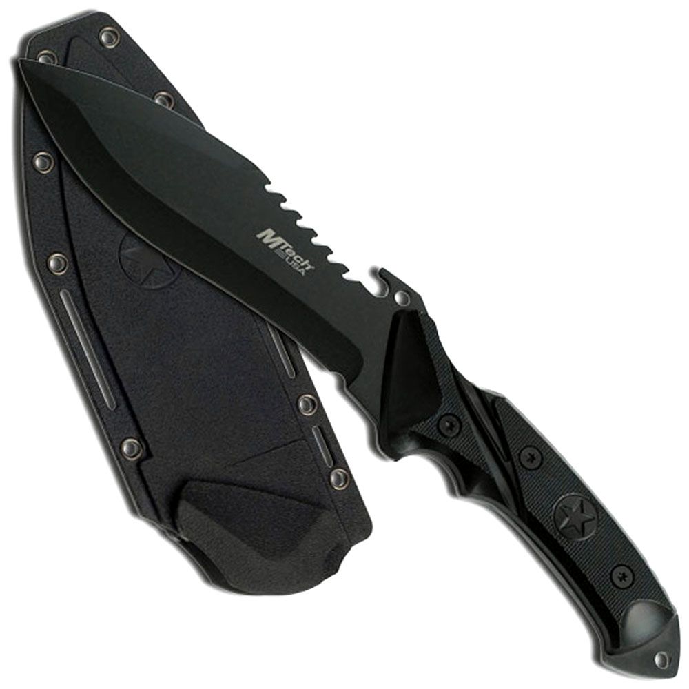 Unveiling a robust and dependable 10" survival knife with tactical prowess. The 5.5" 3mm thick stainless steel blade in striking black finish is ready for any challenge. With a full tang construction and a black injection-molded nylon fiber handle, it ensures strength and a secure grip. This knife includes a matching black nylon fiber sheath for easy and safe carry. Weighing 1.76 lbs, it's a reliable and versatile tool with a 10.75" overall length and a fine edge drop point blade shape, perfect for all your survival and tactical needs.