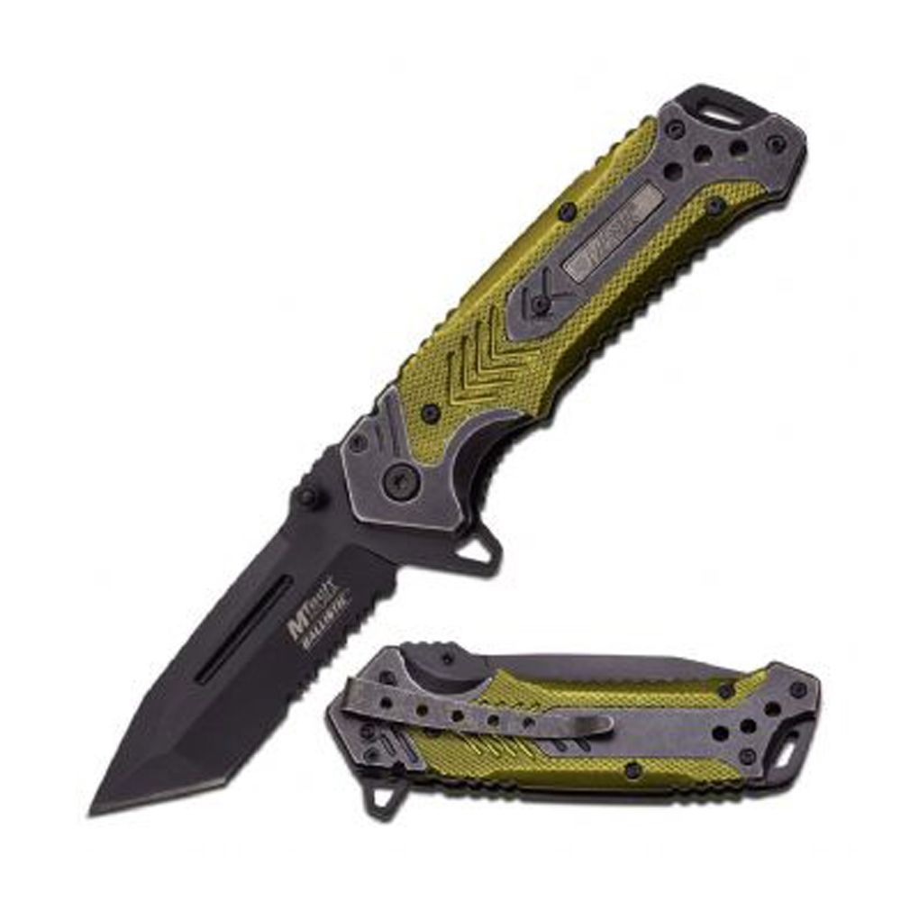 This spring assisted open folding knife from MTech Ballistic offers easy one handed deployment. Once open, the blade locks securely into place with the use of its liner lock. The 3.25" black stainless steel tanto style blade is half serrated offering additional cutting options. The handle is made of stone washed stainless steel and green oxidized aluminum. There is a lanyard hole at the end and a stone washed stainless steel pocket clip ensuring safe and easy transport with multiple carrying options.