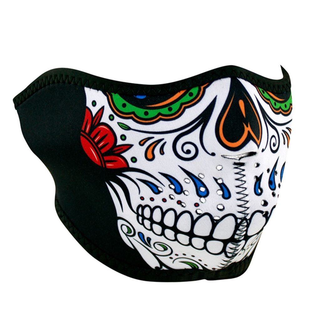 Protect your face from dashing winds and cold temperatures with the Muerte Skull Neoprene Half Face Mask. This half mask covers your nose, cheeks and chin comfortably, and has integrated holes for visibility and breathability. The colourful, Day of the Dead-inspired design looks great under a motorcycle, ski, or airsoft helmet.