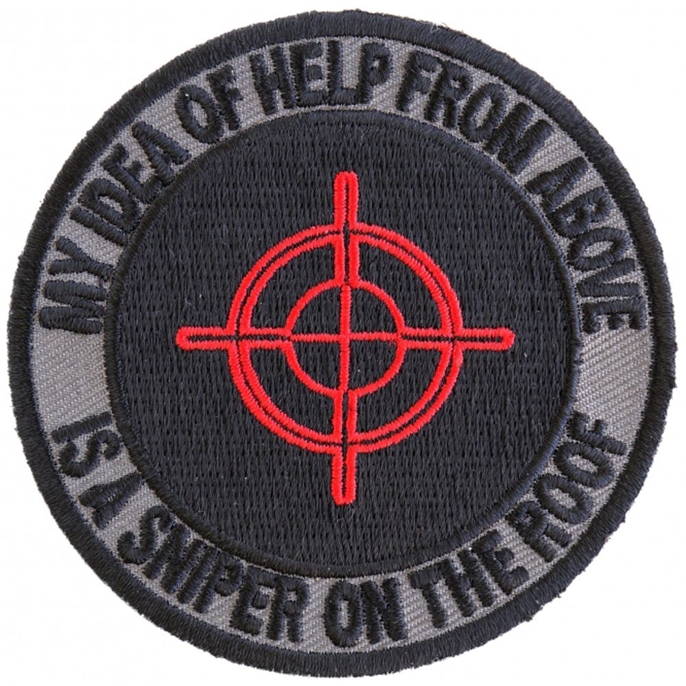 My idea of help from above Sniper on Roof Patch is embroidered in Black / Gray / Red. Measures 3x3 inches. The patch can be sewn or ironed on. Do not iron on patches to leather or nylon material.