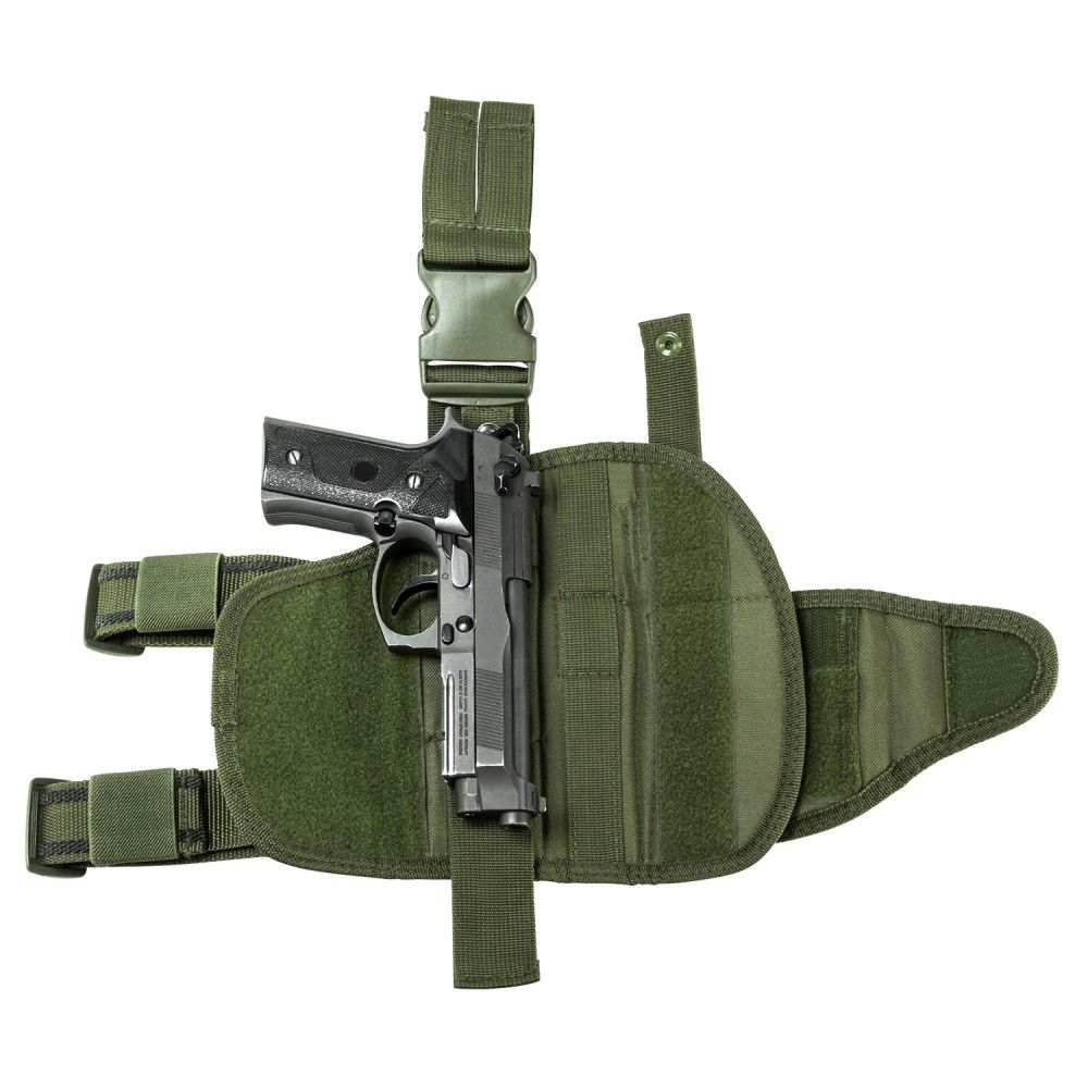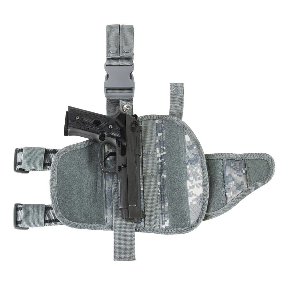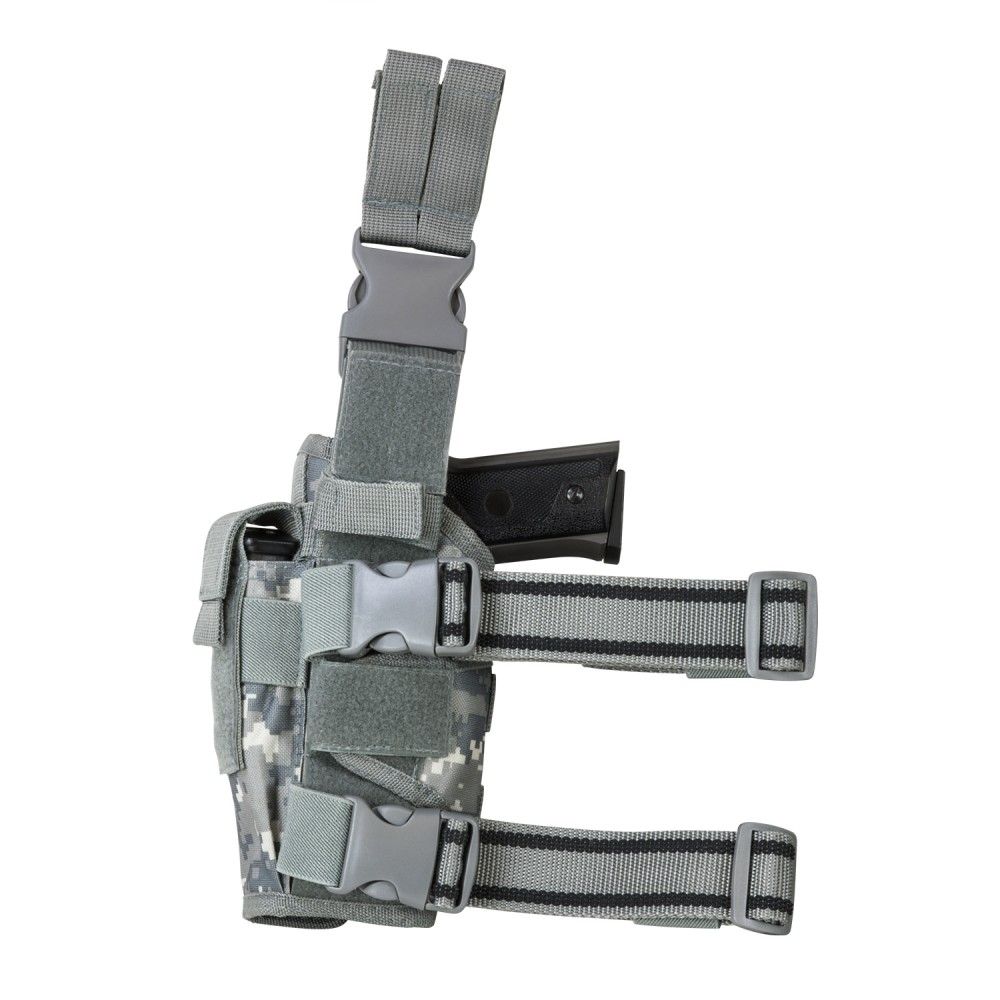 Adjustable Wrap Around Universal Drop Leg (Right Handed) Holster fits most Full Size and Compact Semi-Auto Pistols. This Adjustable Universal Holster features several flaps with hook and loop fasteners. This allows the shooter to adjust the fit around their pistol. Whether the shooter’s pistol is equipped with a tactical flashlight/laser that is attached to their pistols accessory rail or not. This holster can be easily changed to fit various pistol types or several configurations of the same pistol. Thigh Straps has a dual row of rubber material to keep the thigh straps in place. Plastic Quick Connect Buckles for attaching the Holster to your thighs for a quick and easy attachment. Strap Slider for adjustability and to secure the loose end of the strap. Elastic Band sewn with Quick Connect Buckle to expand and contract with thigh muscles. Magazine Pouch has an adjustable magazine flap and an elastic band to keep the magazine secure. Two MOLLE Rows for attaching other MOLLE accessories on the outer wrap around flap. Holster Belt attachment has two nylon loops with thumb snaps for ease and quick attachment to your belt. The two belt loops (split design) help with securing to belt around pant belt loops. Has a large plastic Quick Connect Buckle for quick attachment and removal of the Drop leg Holster from the shooters thigh. Drop Leg Strap is adjustable for drop via hook and loop fasteners. Large plastic Quick Connect Buckle for attaching or removal to/from Belt Loops.