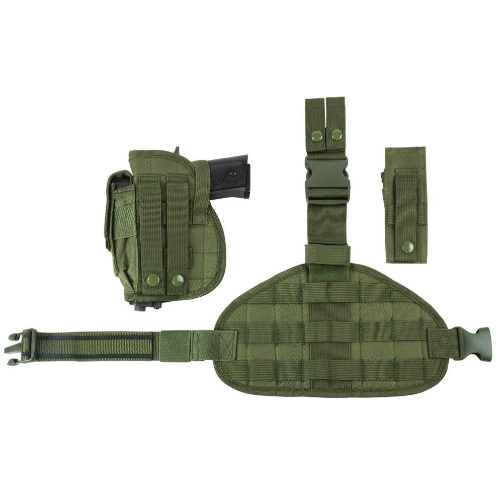 Carry your pistol in style with the NcStar MOLLE Drop Leg System. This tactical holster set includes a drop leg MOLLE panel, pistol holster, and a MOLLE pistol mag pouch. The thigh straps are fully adjustable and come lined with rubber to prevent slipping. The holster measures 190.5 mm (7.5 inches) x 102 mm (4 inches).