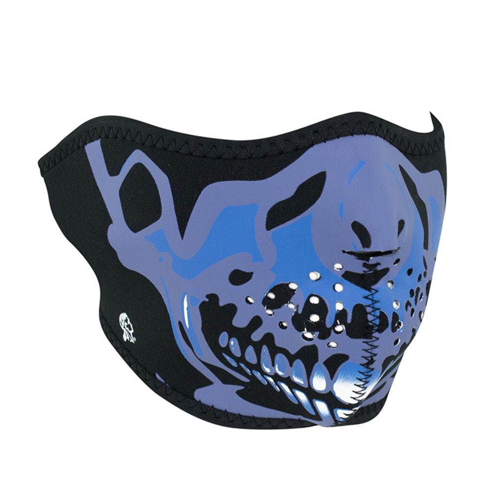 The ZAN Headgear Neoprene Half Face Mask features full coverage of the nose, chin, and cheeks with stretchy, warm and water resistant 2mm thick neoprene. Like most ZAN Headgear face masks it has a black stretch nylon trim for added durability and clean finish. A hook and loop closure allows for adjustability and ensures great fit, and can even be lengthened with our Neoprene Extension Piece (sold separately). Provides coverage of the ears, nose and cheeks from the elements. Can be used with or without a helmet. One size fits most. Blue Chrome Skull design, reversible to Black.