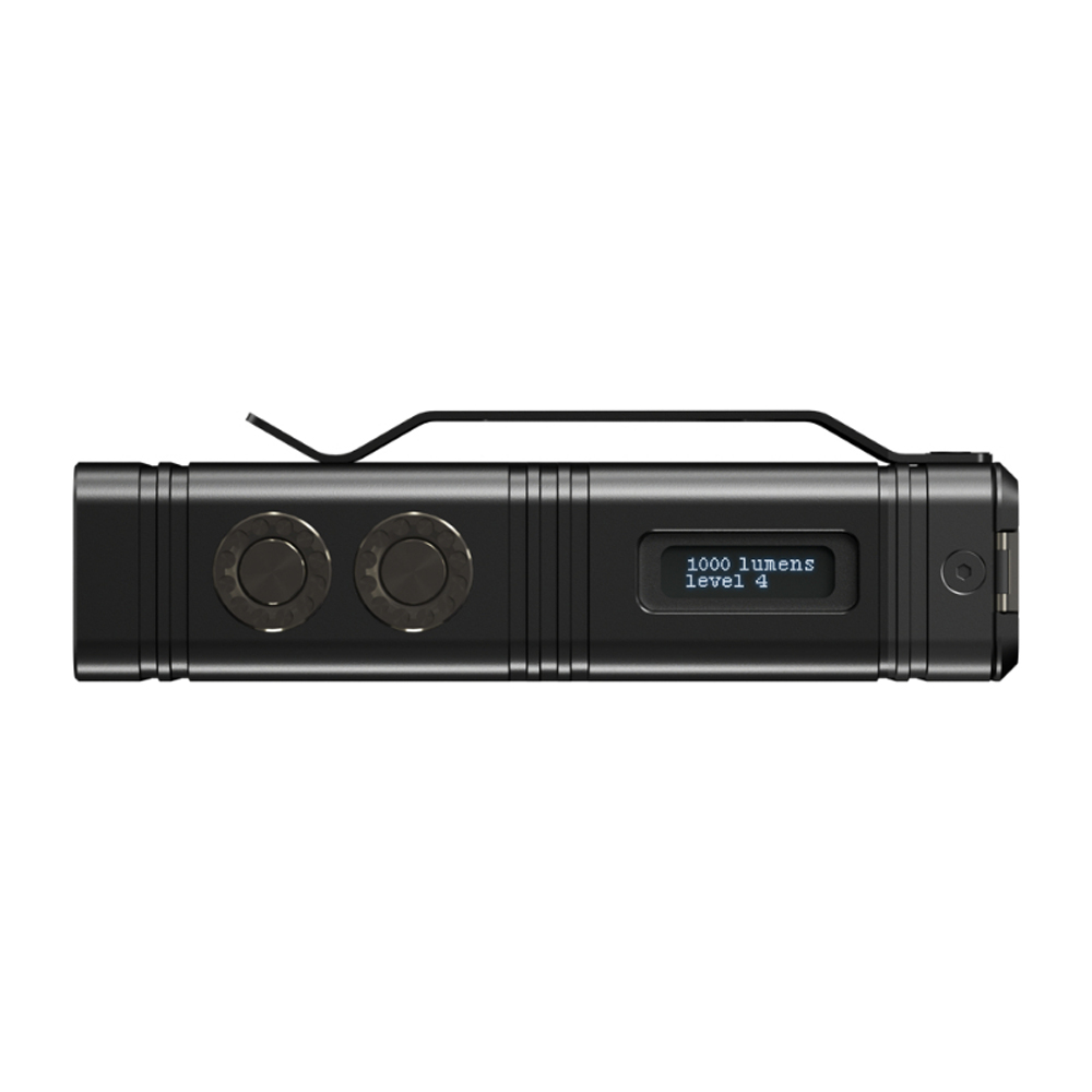 The TM12K is operated by the dual side switches and tail switch, which has a built-in indicator. The multi-functional OLED display screen provides useful information including the current mode, battery voltage, power level, temperature and remaining runtime.