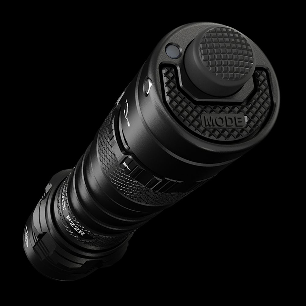 The P22R runs on an included 3500mAh 18650 battery (NL1835HP) that can be quickly charged with the USB-C charging cable. The light is also compatible with CR123/RCR123s. Simply press and hold the mode switch on the tail to enable the strobe mode. To cycle through the 4 brightness levels, short press the mode button when the light is turned on. Mode memory ensures that the same output is activated when the flashlight is turned back on.
