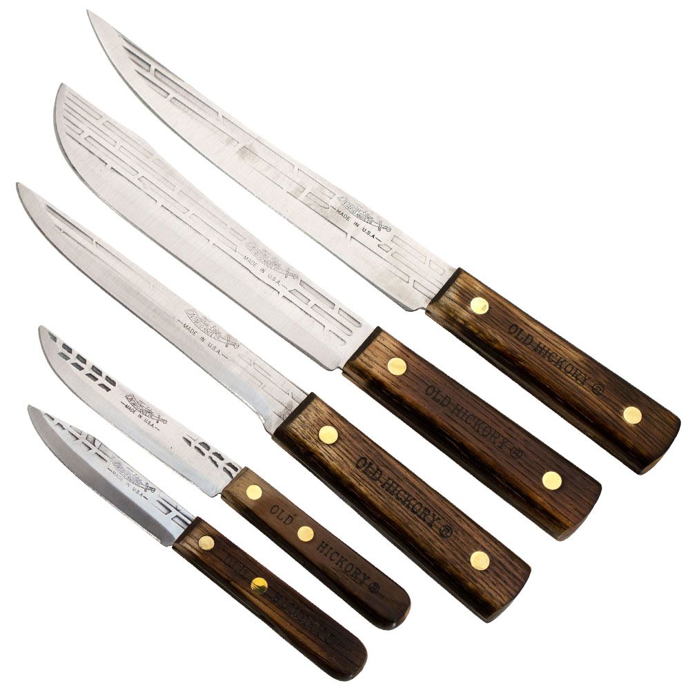 Bring a rustic feel to your kitchen with this OKC Old Hickory Knife Block Set. The beautiful wooden block can be hung on your wall or displayed up on your counter as a gorgeous centerpiece. The traditional hickory wood handles are wear resistant and come with 1095 carbon steel blades.