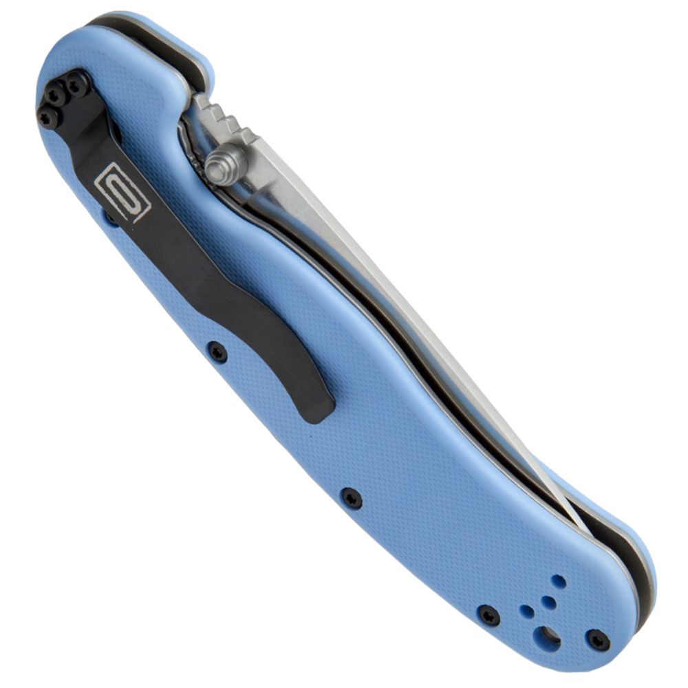 Enjoy the combat and survival utility of this everyday carry OKC RAT Model 1 Folder. Its compact size lets you flick out the AUS-8 stainless steel blade for quick access. The light blue nylon handle has textured grip scales and is fully ambidextrous.