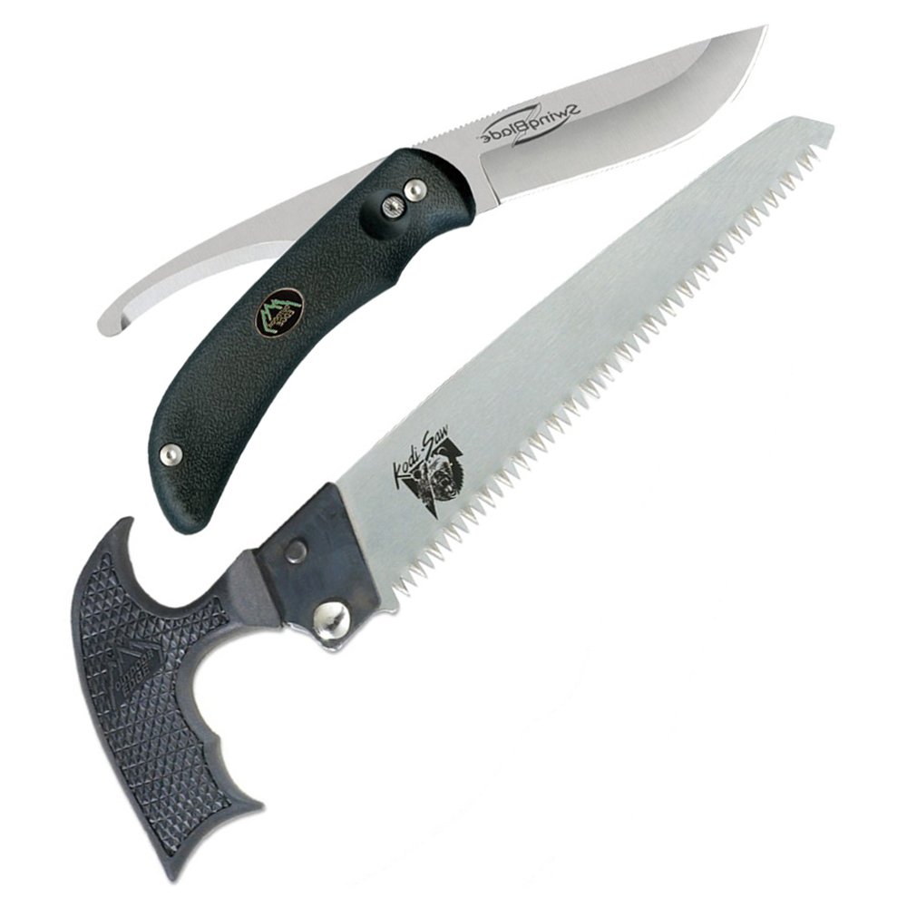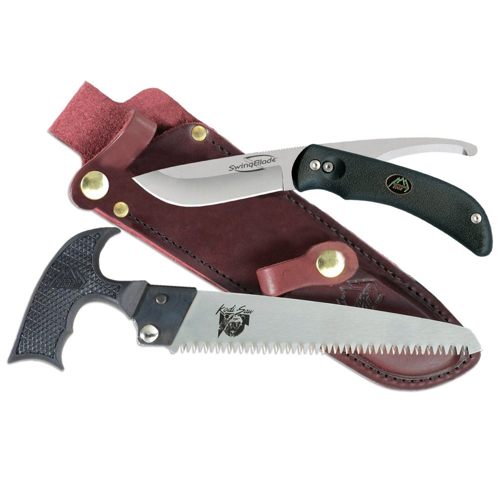 Whether you need quick skinning action or deep sawing utility this Outdoor Edge SwingBlade Hunting Set covers all your bases. The AUS-8 stainless steel skinner blade is razor sharp for fine detail slicing. The opposing gutting hook blade prevents accidental blade piercing with its blunt end. Triple ground teeth cover the 65Mn carbon steel blade of the saw for aggressive cutting.