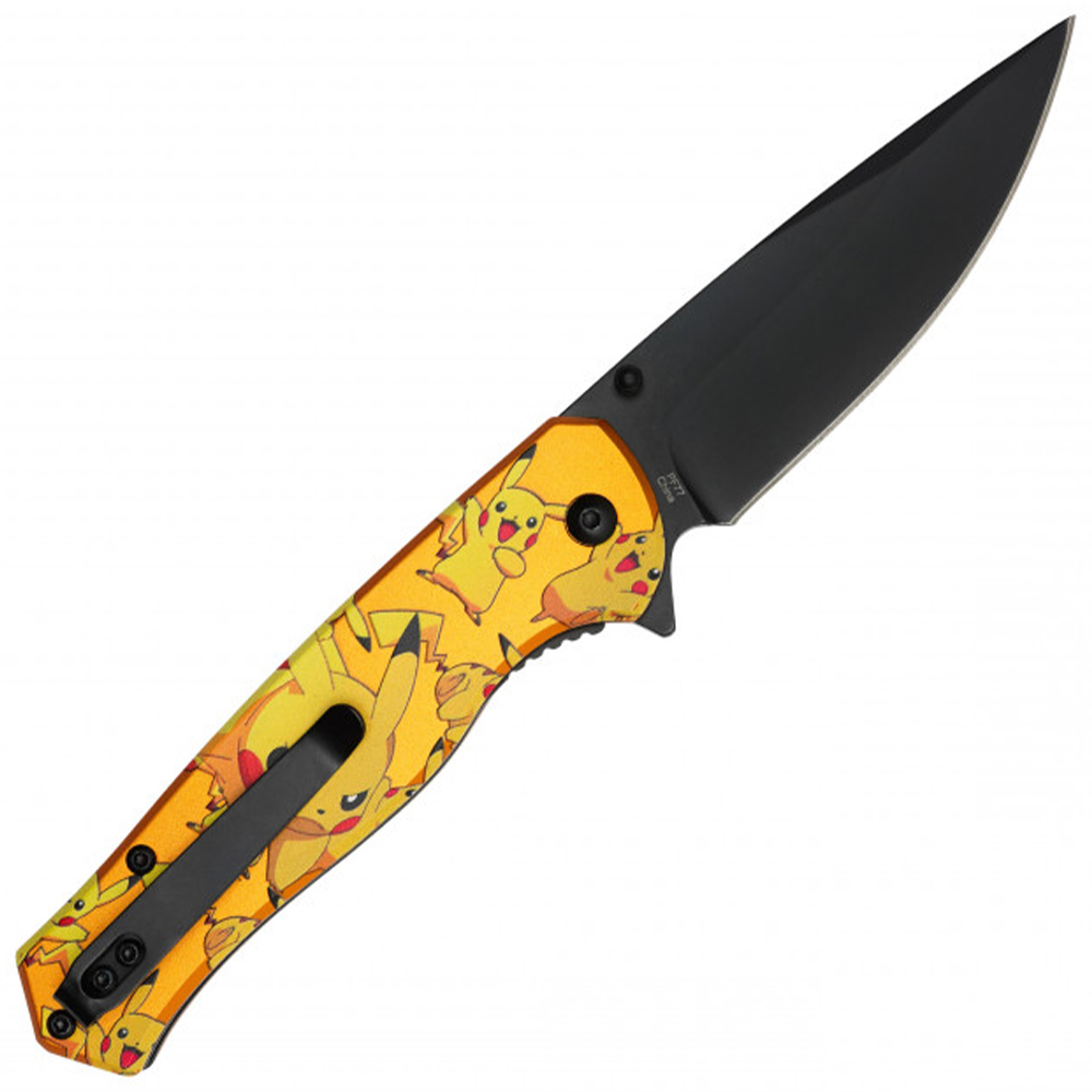 Blending style with practicality, the Pikachu folding knife offers a visually distinctive design with a black steel blade and a gold handle, both detailed with Pikachu artwork.