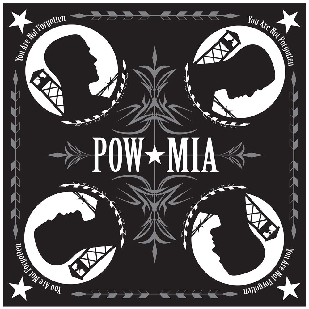 Pow/Mia Bandana features a black & white Pow/Mia pattern. The Bandana is 22" x 22" and is 100% cotton.