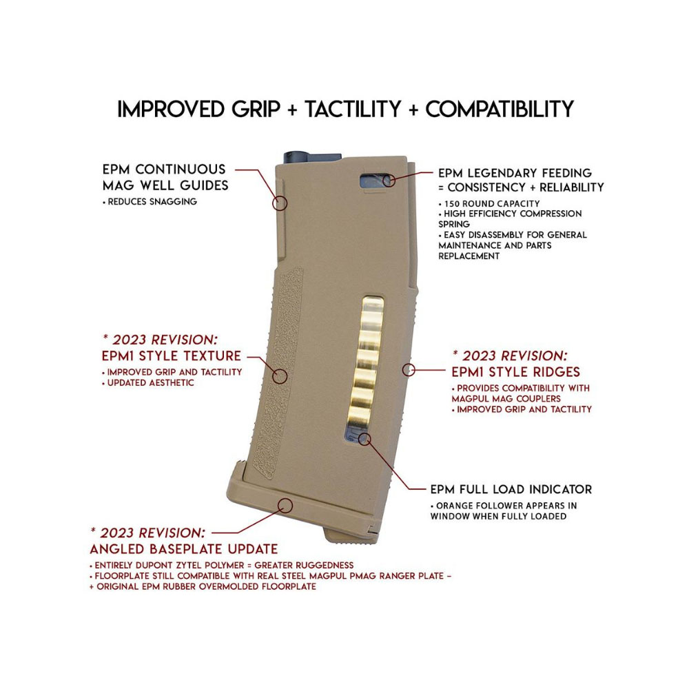 The PTS Enhanced Polymer Magazine (EPM) is a new take on the mid-capacity polymer mags for airsoft AEG's. Constructed from Dupont Zytel Polymer, this magazine is remarkably rugged and features a solid weight. The recessed panels allow for a better grip and the unique mag well guides help reduce the possibility of snagging when being drawn or reinserted into pouches. The bullet window features realistic looking dummy 5.56 rounds and even has a visual indicator at the bottom of the clear window to show the magazine is full (orange follower will be visible when fully loaded).