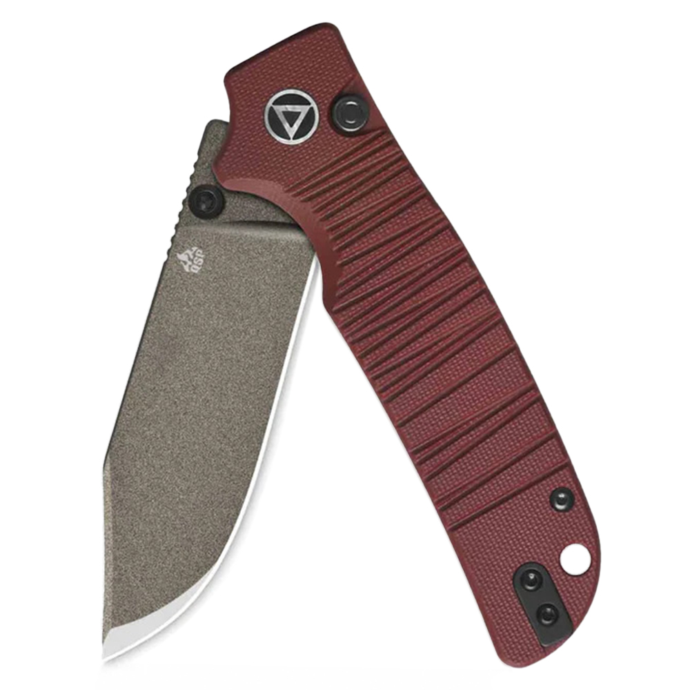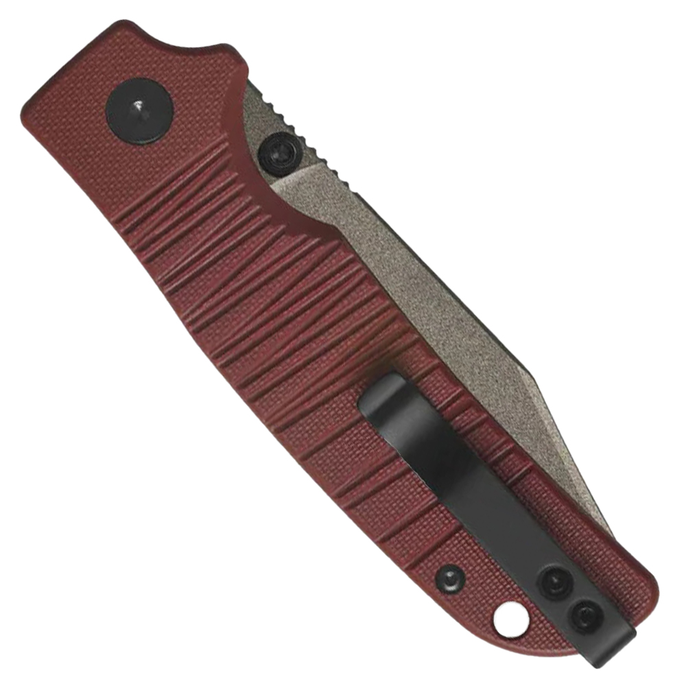 The button lock ensures safe operation, and the dark red G10 handle delivers a secure, comfortable grip for everyday use.