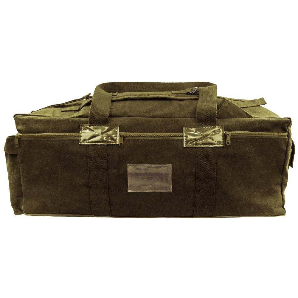 This Raven X extra-large tactical bag functions as both a duffle and backpack. Constructed from rugged heavyweight canvas with a waterproof PVC bottom, it provides reliable protection in even the most grueling environments. In addition to the spacious main compartment, the exterior of the bag is equipped with an ID holder, three single-zipper document pockets, and three utility pockets for fast-access to often used equipment. It has multiple carry options with adjustable padded shoulder straps as well as extra-long reinforced carry handles. Measures 34" x 15" x 12".