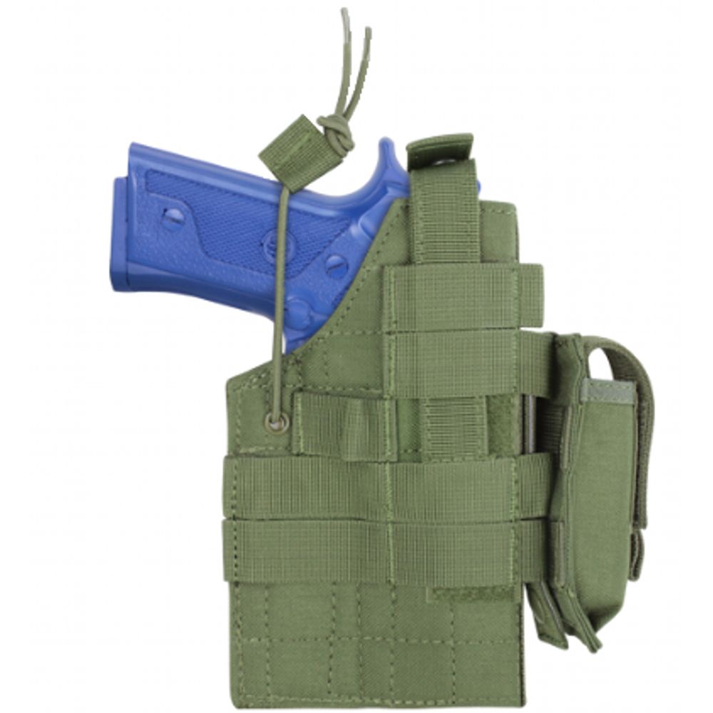If the holster fits, wear it! This Raven X holster was made to fit the unique size, shape, and contours of a Beretta handgun. Constructed from durable 1000D nylon, this rig features a quick-access button clasp retention strap. It can be mounted directly onto your tactical vest, drop leg panel, or any other MOLLE gear.
