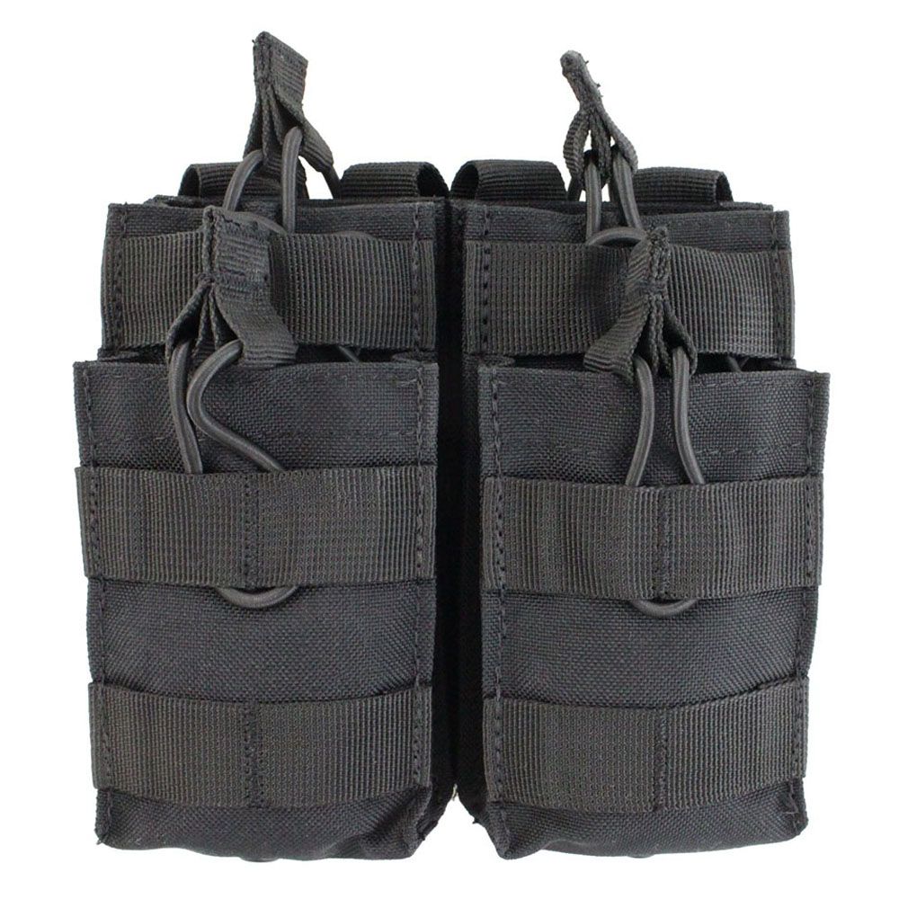 This Raven X mag pouch can carry up to four M4 or M16 magazines in a space efficient stack. Built from durable 1000D nylon with bungee retention cords, MOLLE webbing, and PALS back straps. Front pockets measures: 4.5" x 3" x 1". Back pockets measures 5.75" x 3" x 1".