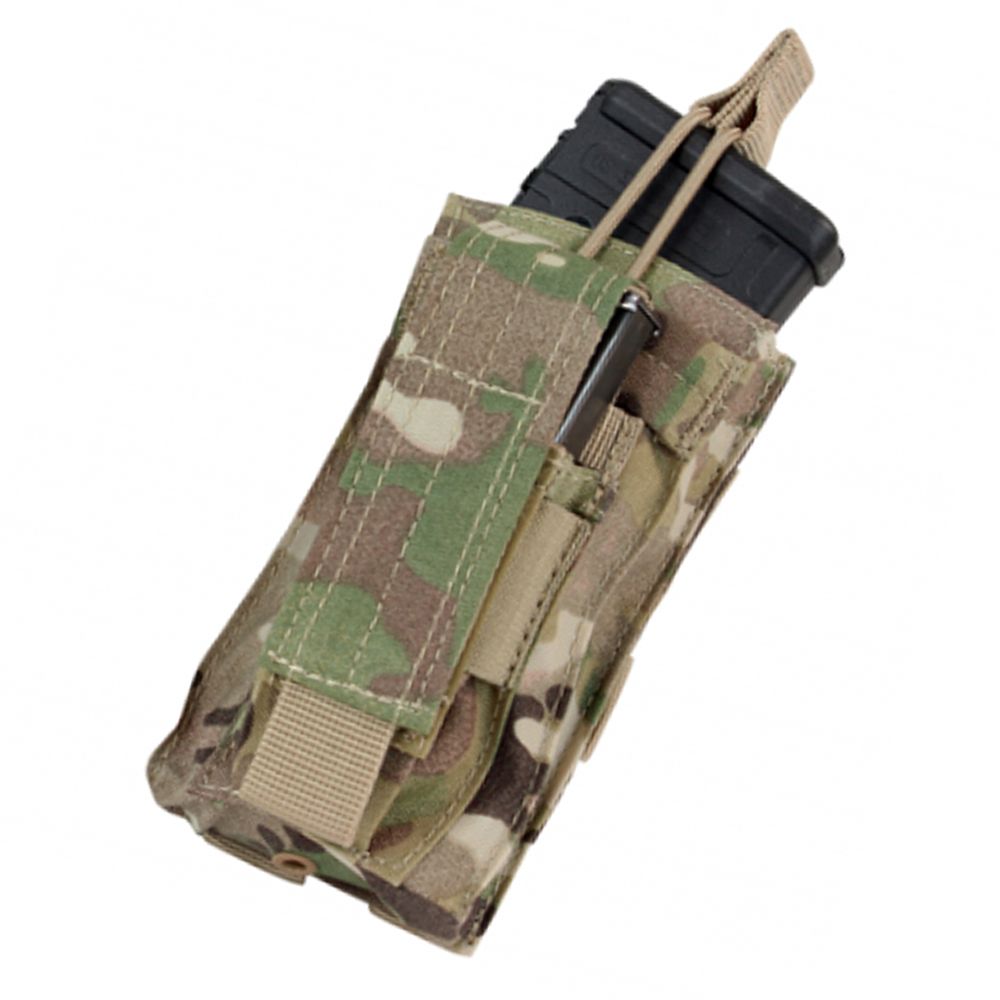 This Raven X combination magazine pouch can hold an M4/M16 rifle mag, as well as a pistol mag in a convenient kangaroo stack. It features both an open top bungee cord design and a hook and loop cover flap. With this pouch you can keep a spare magazine for your primary weapon and sidearm in the same place! Pouch measures 6” x 3” x 2”.