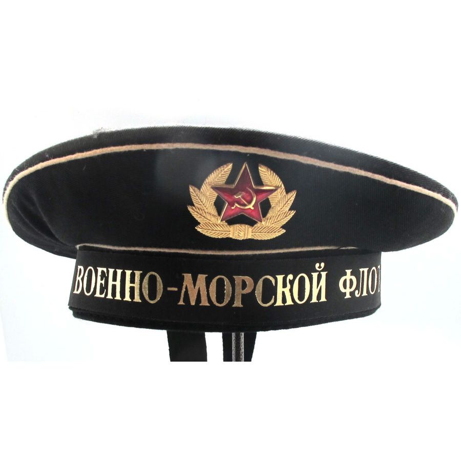 The Russian Donald Duck Sailor Hat is a vintage hat style worn by members of the Soviet Union naval forces during WWII. This replica black cloth cap features authentic details, including a Soviet badge and gold Russian lettering on the front of the brim. The ribbons on the back of the cap are printed with gold anchors. This hat is ideal for collectors and Russian history enthusiasts.