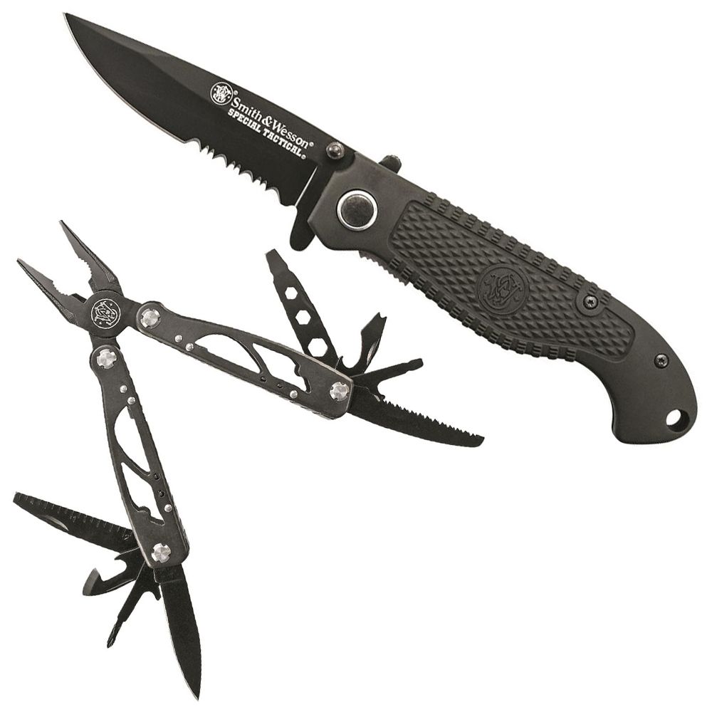 There is nothing quite as useful or as lightweight as a multi-tool. The S&W 2pc Multi-Tool and Folding Knife Kit not only includes a 15-function tool, but also comes with a lightweight liner lock knife. The multi-tool has spring loaded pliers, a saw, file, and more. The folding knife features a partially serrated black drop point blade and a composite handle. When not in use, it can be carried with the included pocket clip.