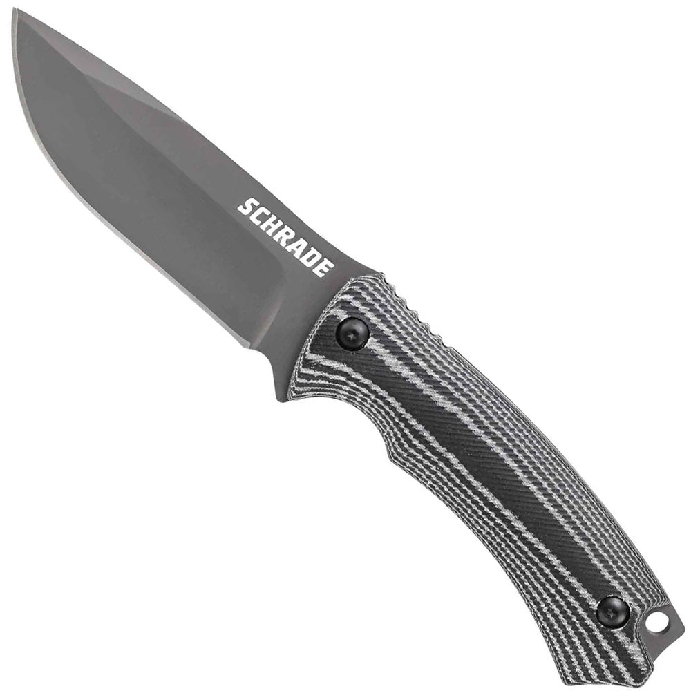 Schrade® Full Tang Fixed Blade Knife, Titanium Coated Digital Urban Camo Coated 8Cr13MoV High Carbon Stainless Steel Drop Point Blade, Picked Micarta Handle Slabs with Thumb Rest Jimping, Lanyard Hole, and Schrade Logo Shield, Ballistic Belt Sheath.