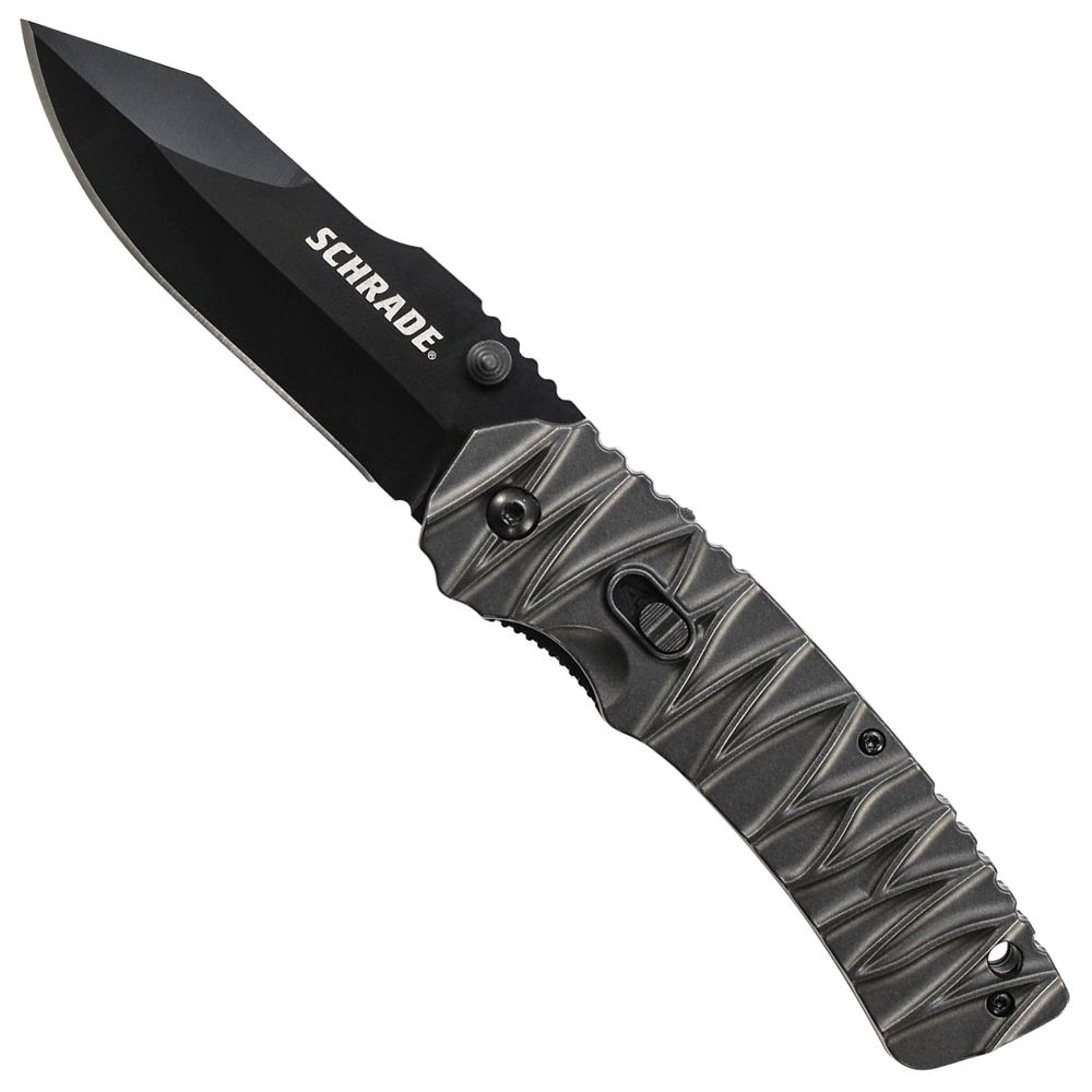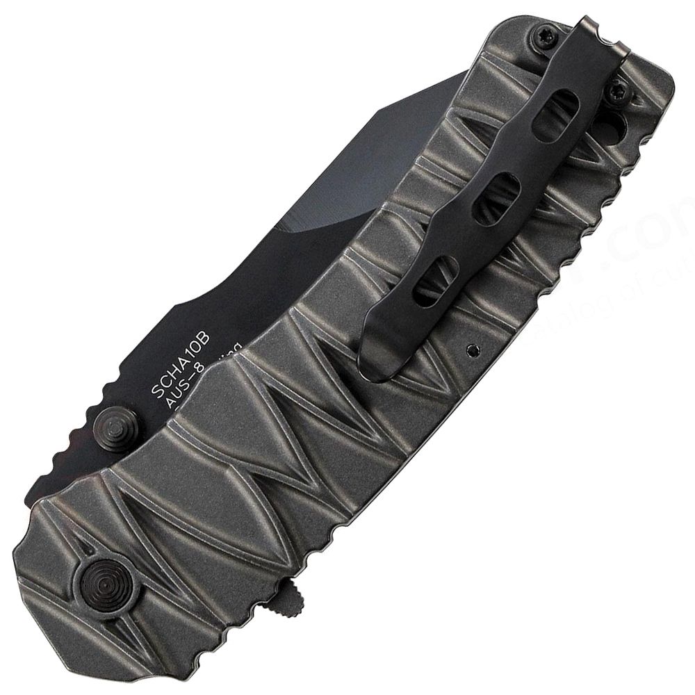 The Schrade A10 Series of assisted opening knives feature durable milled aluminum handles with a shape that really locks it into your hand well. The blade is a highly functional drop point shape, much like a reverse tanto, made from black coated AUS-8 high carbon stainless steel and you have your choice of partially serrated or not. These attractive designs feature fast operation and a very solid feeling in the hand. They are great EDC options with non-reversible pocket clips set up for tip up carry and a safety mechanism. Knifecenter.com carries the full line of both Schrade and Smith & Wesson knives and they are some very cool and functional tools always at a great price!