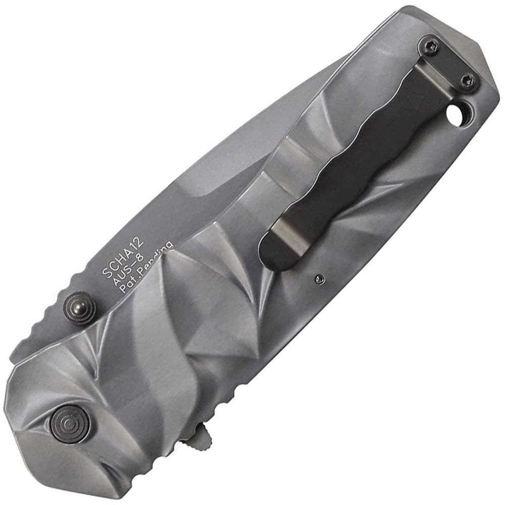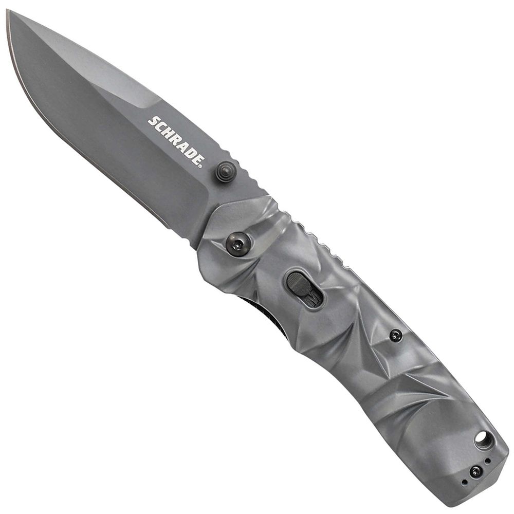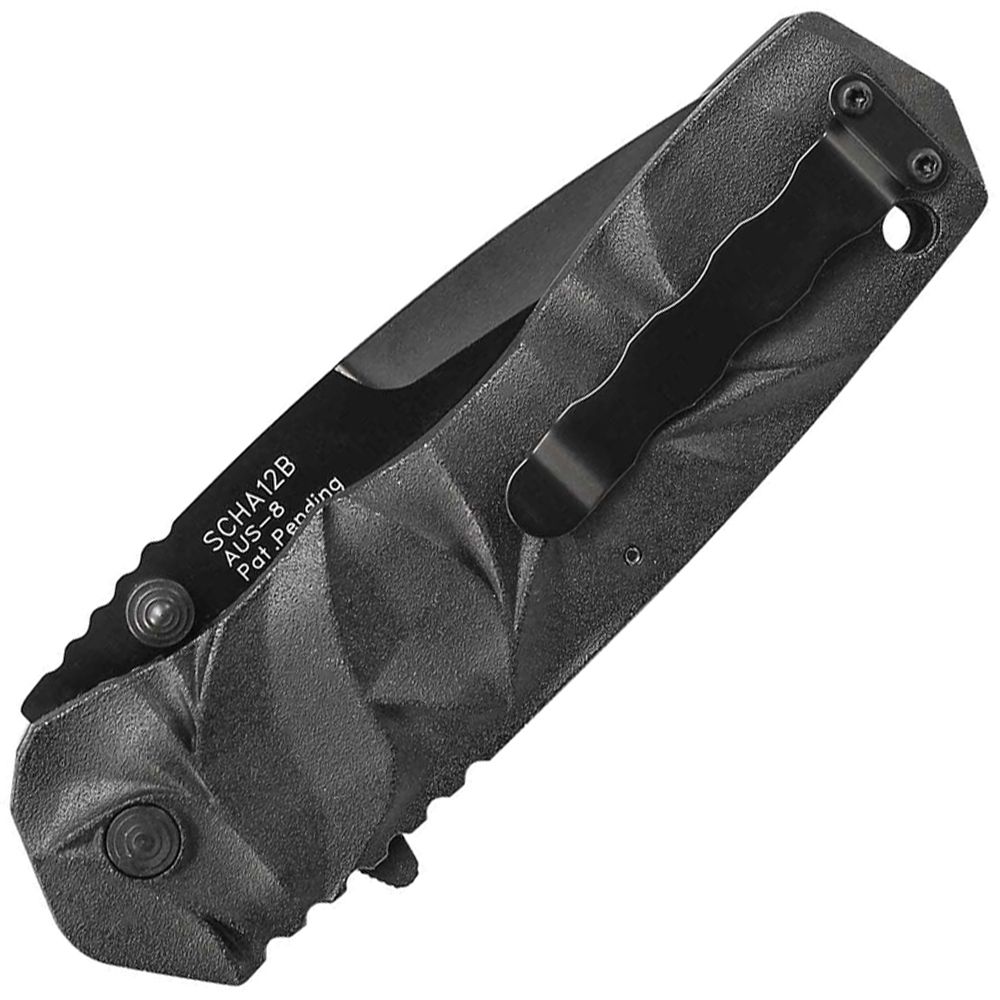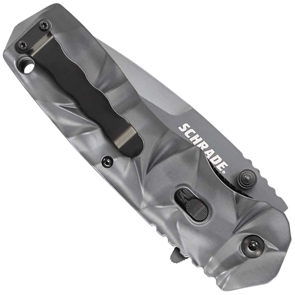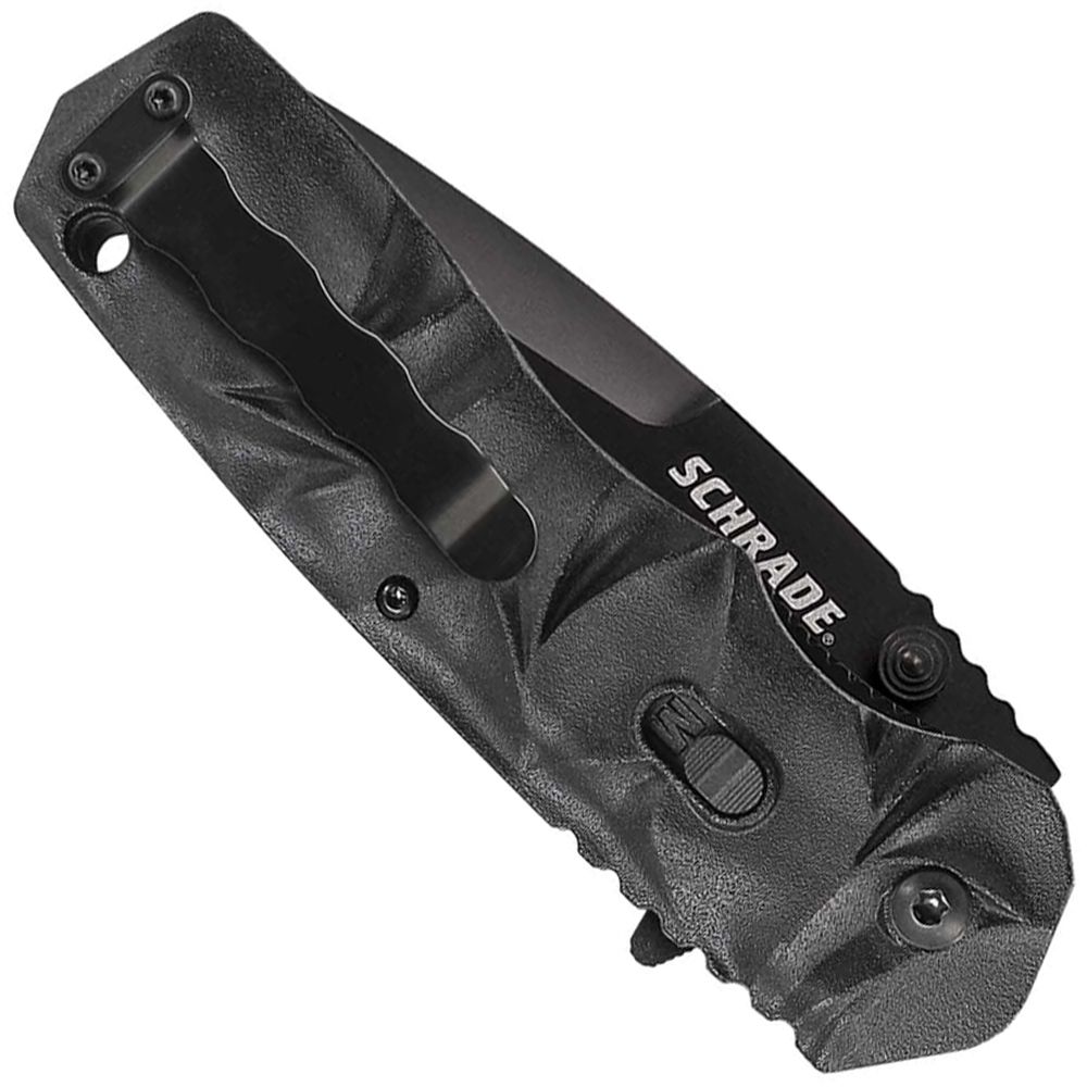 Schrade® M.A.G.I.C. Dual Action Manual & Assisted Opening Liner Lock Folding Knife, Black AUS-8 High Carbon Stainless Steel Drop Point Blade with Ambidextrous Thumb Knobs and Thumb Ramp Jimping, Black Coarse Coated Aluminum Handle with Manual/Assist Switch and Thumb Jimping, Lanyard Hole, Reversible Pocket Clip.