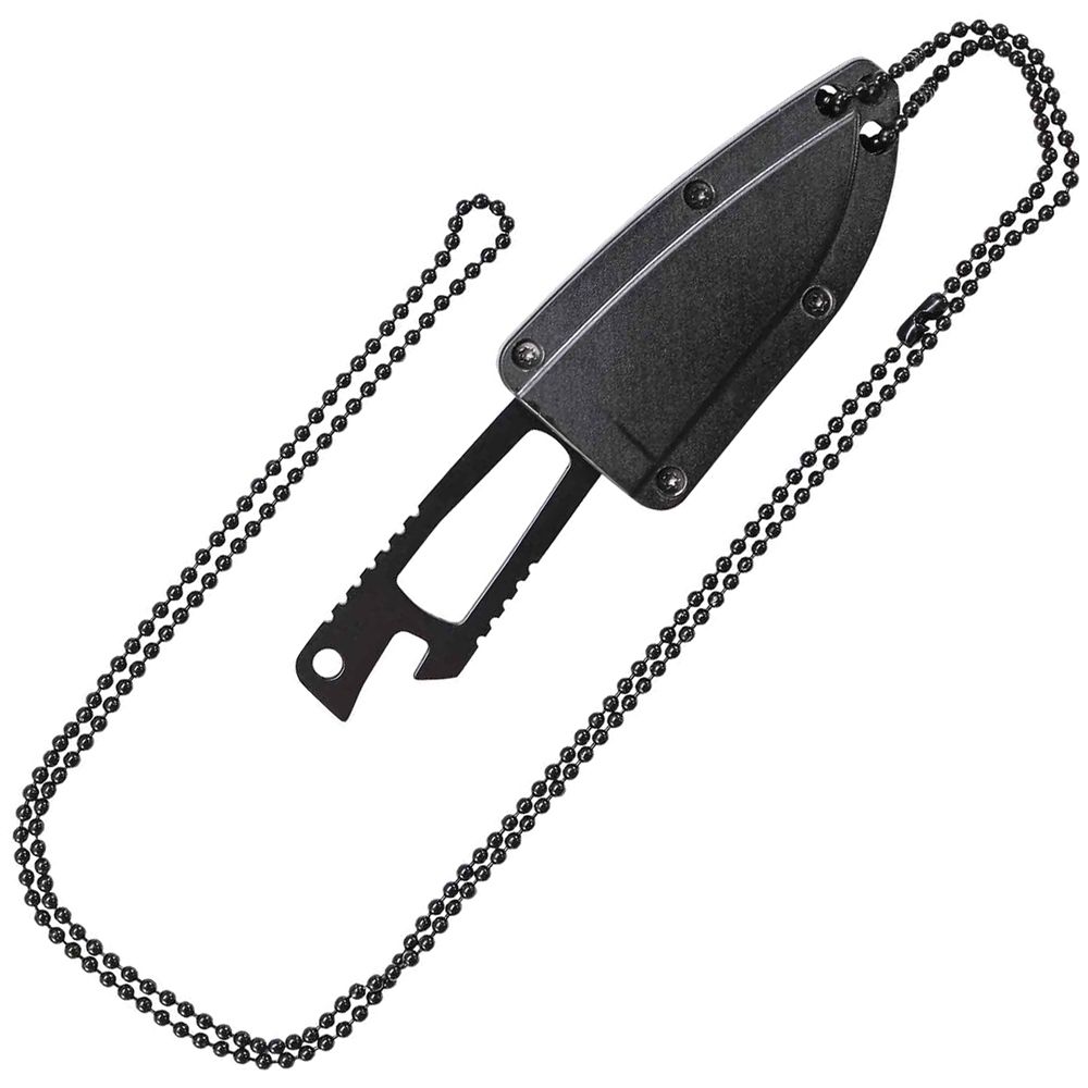 Schrade Mini Full Tang Neck Knife Fixed Blade, Black 7Cr17MoV High Carbon Stainless Steel Drop Point Blade with Spine Jimping, Skeleton Handle with Spine and Grip Jimping, Bottle Opener, Lanyard Hole, and Neck Sheath with Breakaway Chain.