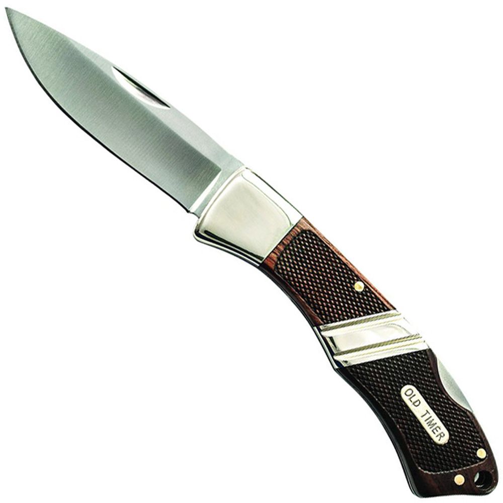 Old Timer Mountain Beaver Sr. Large Lockback 9Cr18MoV High Carbon Stainless Steel Drop Point Blade with Nail Pull, Nickel Silver Bolsters, Heat Treated Back Spring, Brass Pins, and Rosewood & Ebony Wood Handle with Lanyard Hole and Leather Belt Sheath.