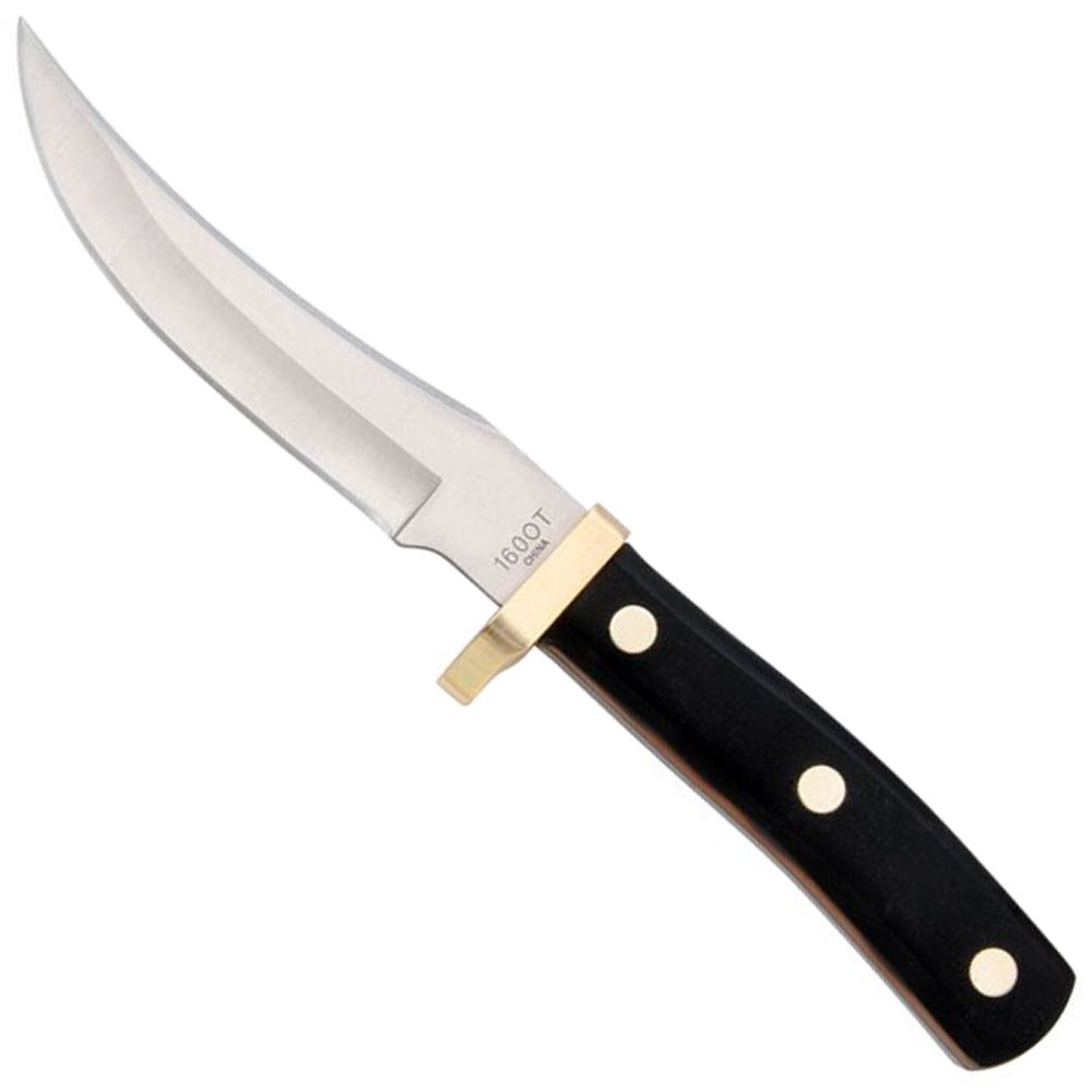 Old Timer Mountain Lion Full Tang Fixed Blade Knife, 7Cr17MoV High Carbon Stainless Steel Clip Point Blade, Old Timer Sawcut Handle Slabs with Nickel Silver Guard, and Brown Leather Belt Sheath.