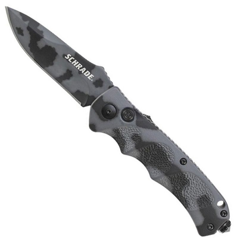 Schrade Push Button Lock Folding Knife, Urban Camo 4116 Stainless Steel, Urban Camo Aluminum Handle with Push Button Lock, Glass Break, Lanyard Hole, and Pocket Clip.