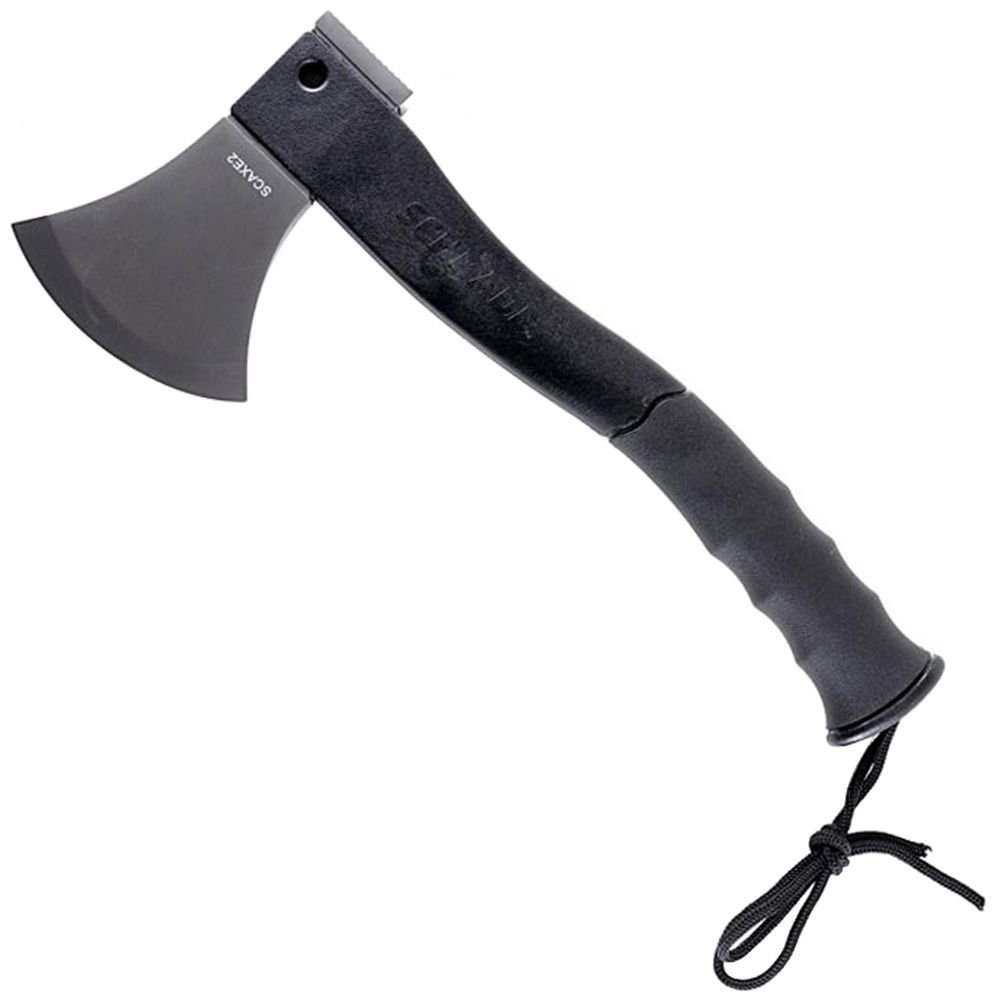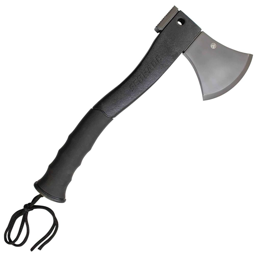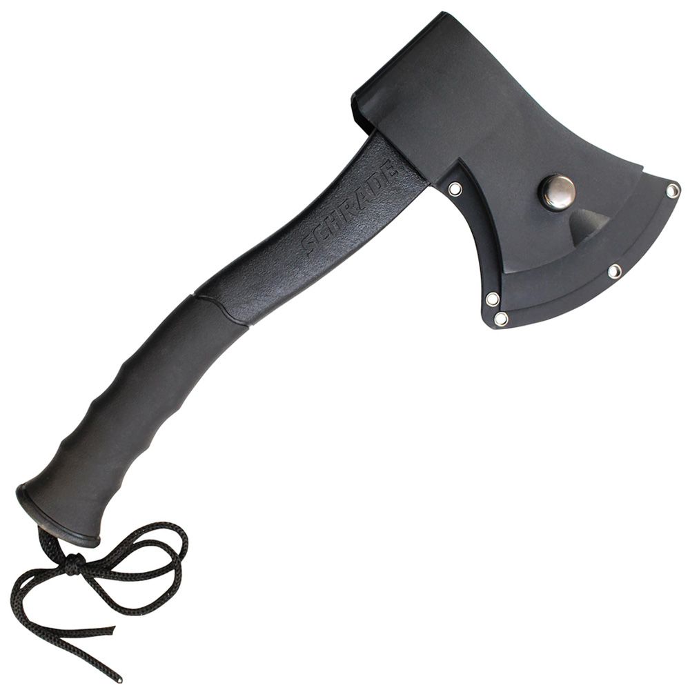 Schrade Survival Hatchet, Titanium Coated 3Cr13 Stainless Steel Head with Hammer Pommel, Black Glass Fiber Filled PA Handle with Ergonomic Black TPR Rubber Grip, Extra Large Ferro Rod with Lanyard Stores Inside Handle, Thermoplastic Belt Sheath.