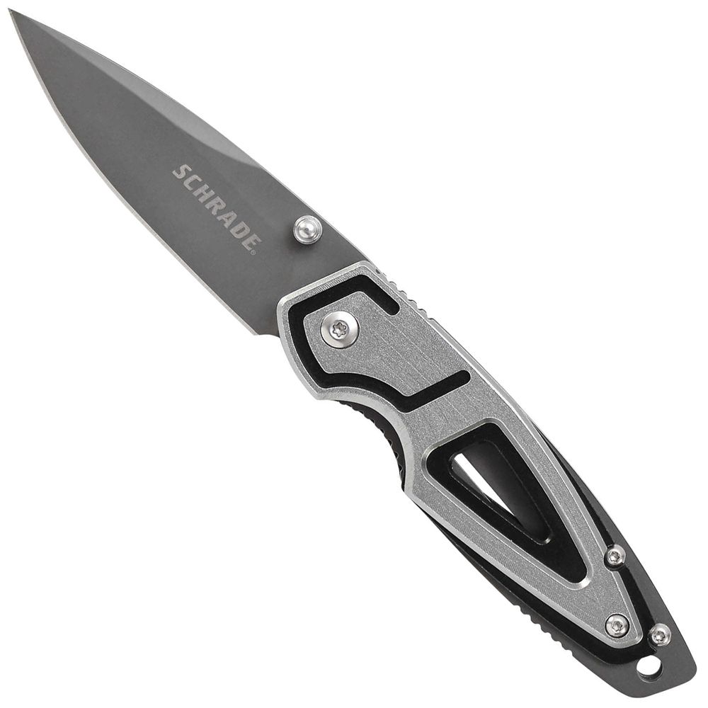 Schrade Liner Lock Folding Knife, Titanium Coated 8Cr13MoV High Carbon Stainless Steel Drop Point Blade with Thumb Knob, Grey & Black Layered Aluminum Handle Slabs with Pocket Clip.