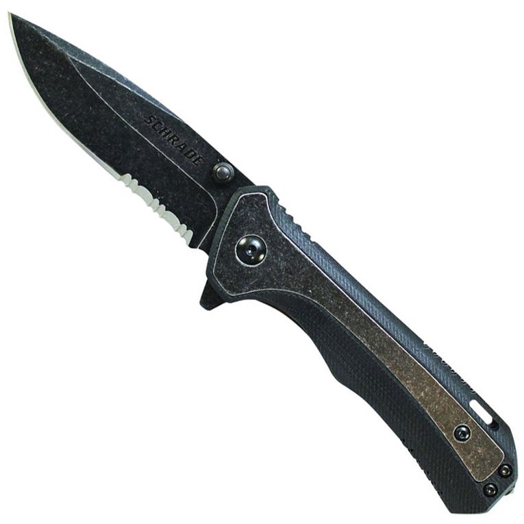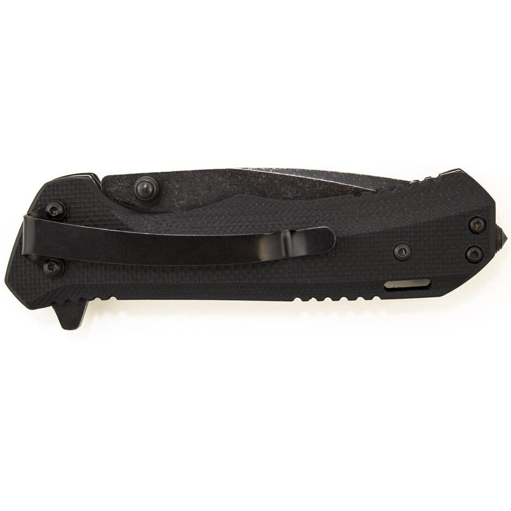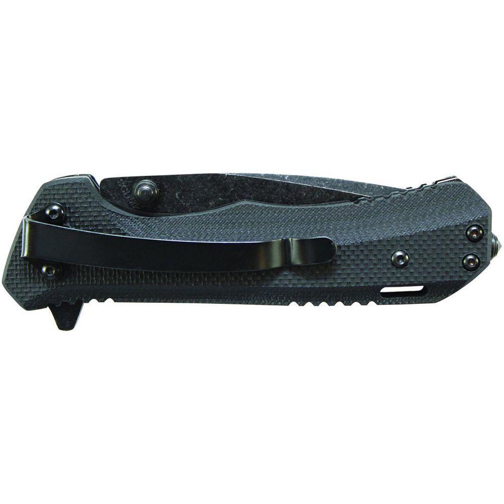 The Schrade 500 series of knives are tactically built utility folders with both style and function. The handle is a comfortably contoured G-10 with multiple runs of jimping for a secure hold in various grips. The thumb studs work equally as well as the flipper and the knife has the added bonus of a glass breaker on the butt end. This is a great knife design and is good looking to boot with the smooth ground G-10 and blackwash finished blade.