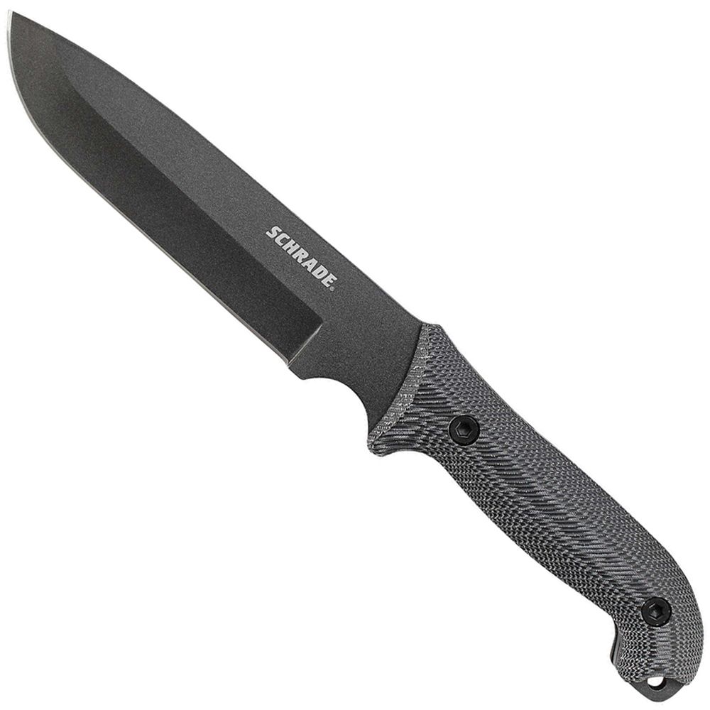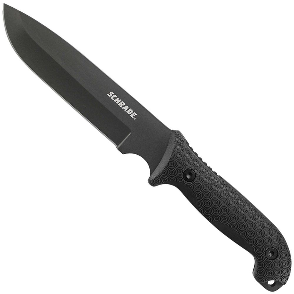Schrade® Frontier Full Tang Fixed Blade Knife, 1095 High Carbon Steel Drop Point Blade with Finger Choil, Ring Textured TPE Handle with Spine and Grip Jimping, Lanyard Hole, Black Polyester Belt Sheath with Ferro Rod and Sharpening Stone.