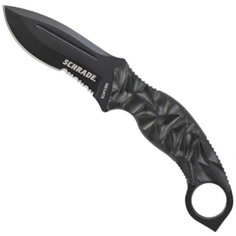 Schrade Full Tang Fixed Blade Knife, AUS-8 High Carbon Stainless Steel Partially Serrated Drop Point Blade with Blood Groove, TPE Overmold Hanlde with Thumb Ramp, Spine, & Palm Jimping, Finger Hole, Crusher, and Glass-Filled Nylon Sheath.