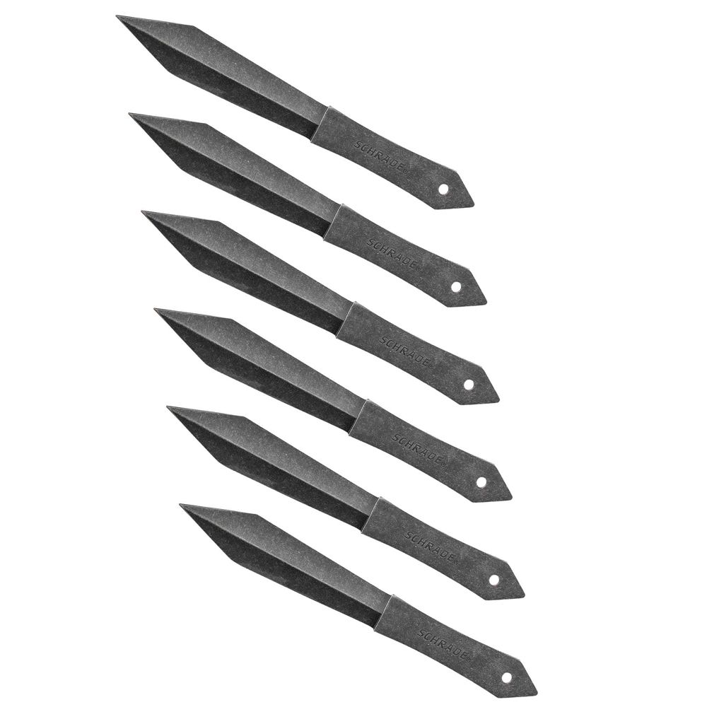 Schrade 6 pc. 8" Full Tang Throwing Knife Set, Stone Washed 2Cr13 Stainless Steel Double Edged Blades, Stone Washed 2Cr13 Stainless Steel Handle with Lanyard Holes, 3 pc. Black Polyester Belt Sheaths, 3 Paper Targets.
