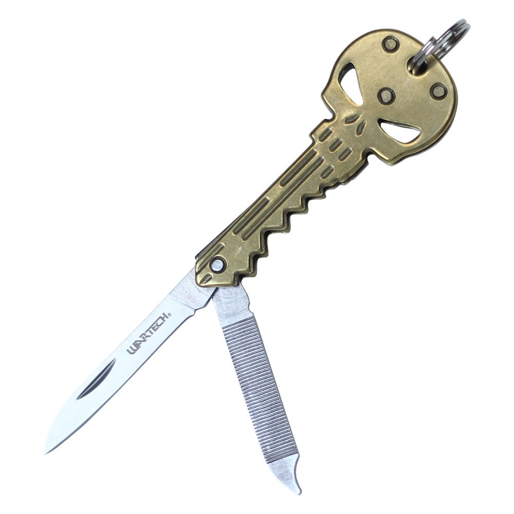 Hidden in plain sight, our Gold Punisher Skull Key Pocket Knife looks just like one of your keys hanging on your key ring. The gold pocket knife has a sharp 2” blade and a 1 3/4” file, which are both of 3Cr13 stainless steel and feature nail nicks. The 2 1/2” overall, key-shaped knife is made of stainless steel with the iconic Punisher Skull incorporated into the design. This mini pocket knife makes a great gift for any occasion.