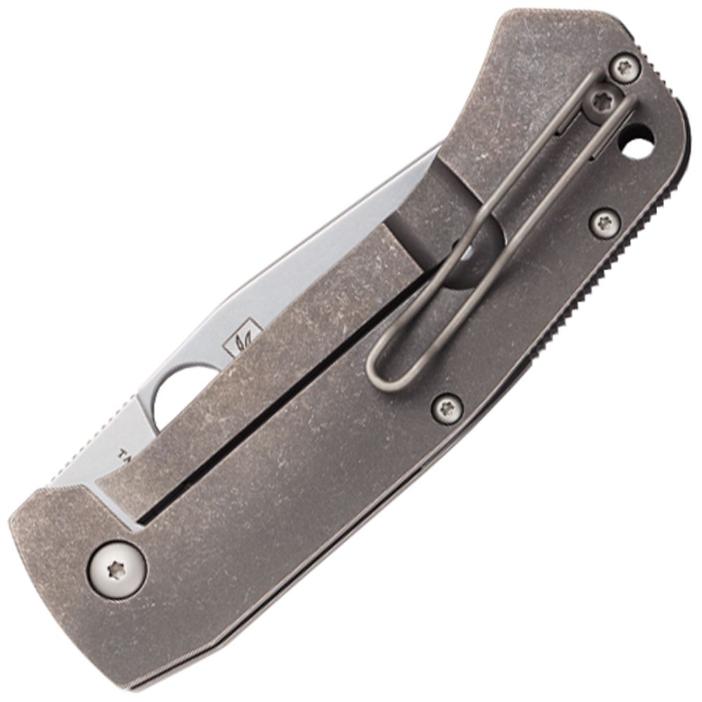 The handle of the Slysz Bowie is constructed from two solid titanium scales, one of which forms the basis for its sturdy R.I.L. mechanism. Unlike most knives of its type that have flat scales, the scales of the Slysz Bowie are gently radiused across their entire width to offer much better ergonomics. They are also stonewashed to a dull battleship gray that enhances their grip texture and provides greater control during use. The butt end of the handle features a unique G-10 spacer with two sections of strategically placed jimping to further enhance the knife’s grip texture and aesthetic appeal. It’s also home to a reversible deep-pocket wire clip that supports left or right-side tip-up carry and rides low in the pocket for maximum discretion.