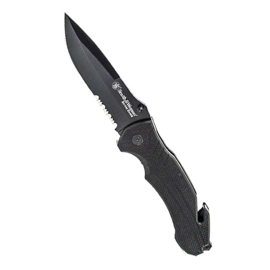 The Smith & Wesson Border Guard SWBG5S is a large folder that sports a drop point style blade with a partially serrated edge. The handle features a built-in seat belt cutter and glass breaker pommel with lanyard hole. Textured G-10 scales help keep the Bo