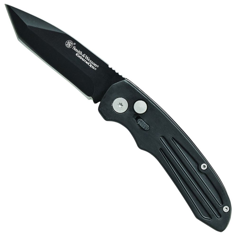 Smith & Wesson Extreme Ops Push Button Lock Folding Knife, Black 7Cr17MoV High Carbon Stainless Steel Tanto Blade with Spine Jimping, Black Aluminum Handle with Pocket Clip